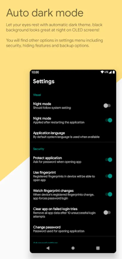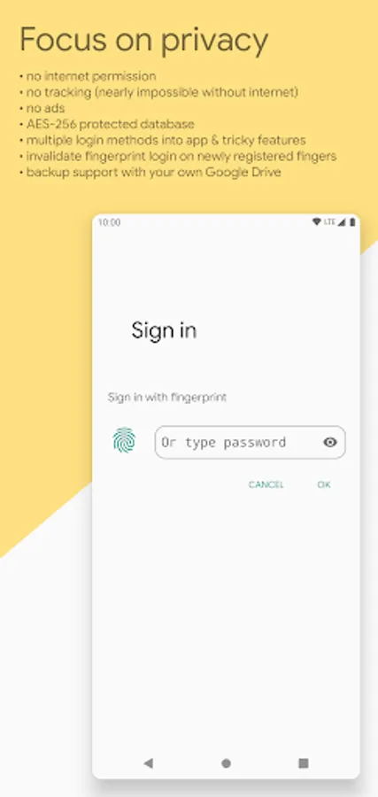 • Minimal permissions (biometric (login), boot_completed (reset notifications), system_alert_window (floating windows))