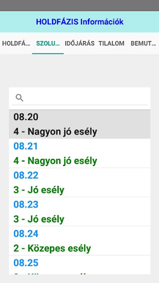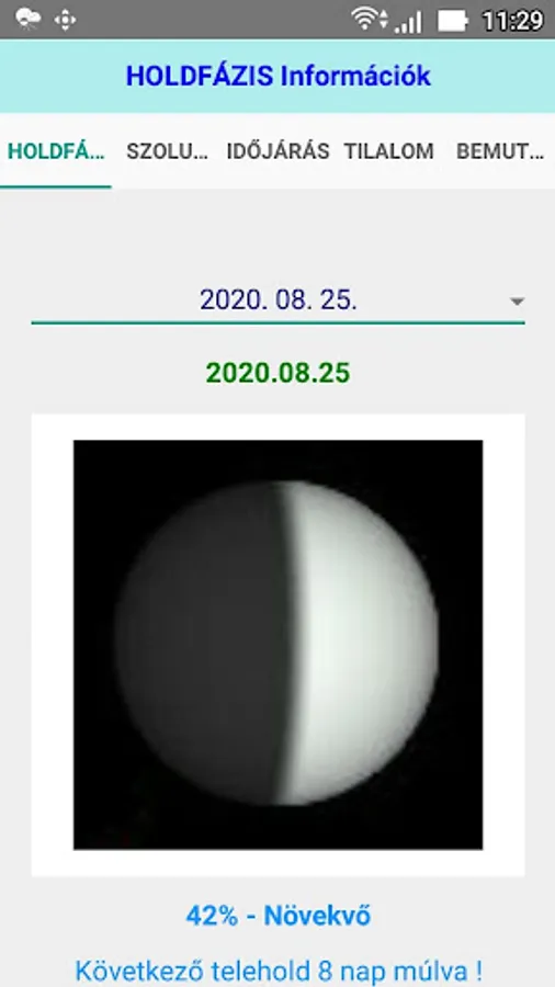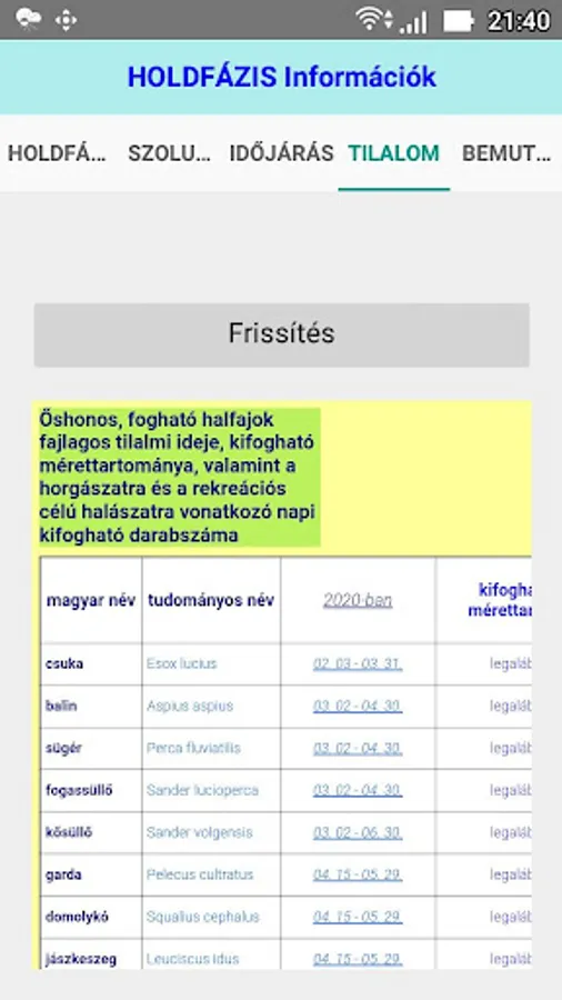 The application displays the current lunar phase (for the territory of Hungary), the solar calendar data, current weather data, and also includes catch bans (may be useful for anglers).