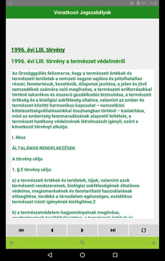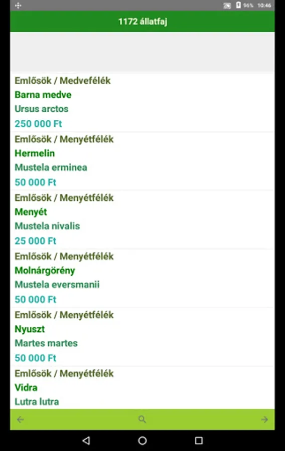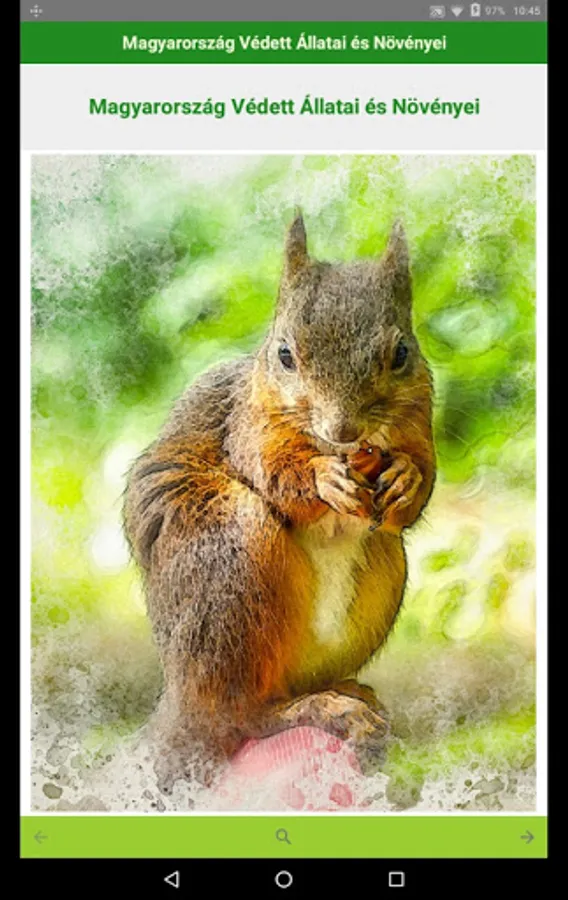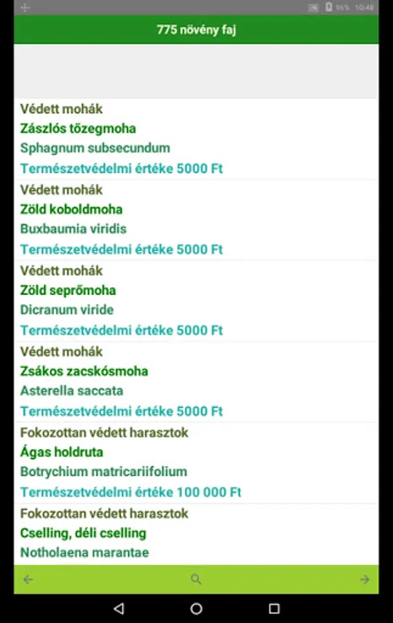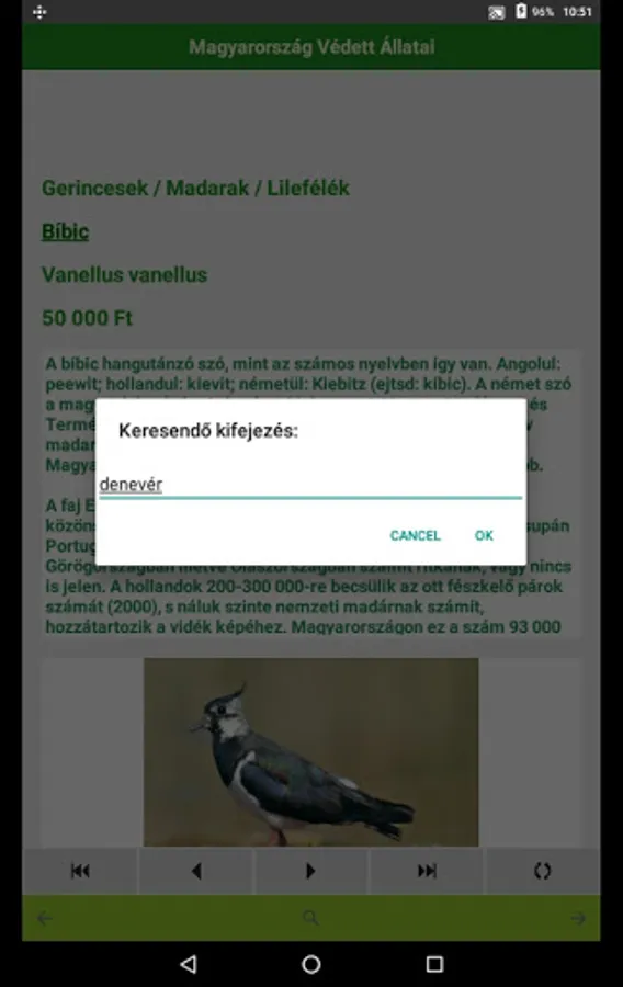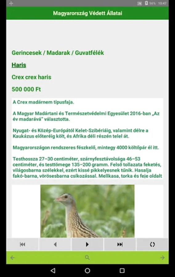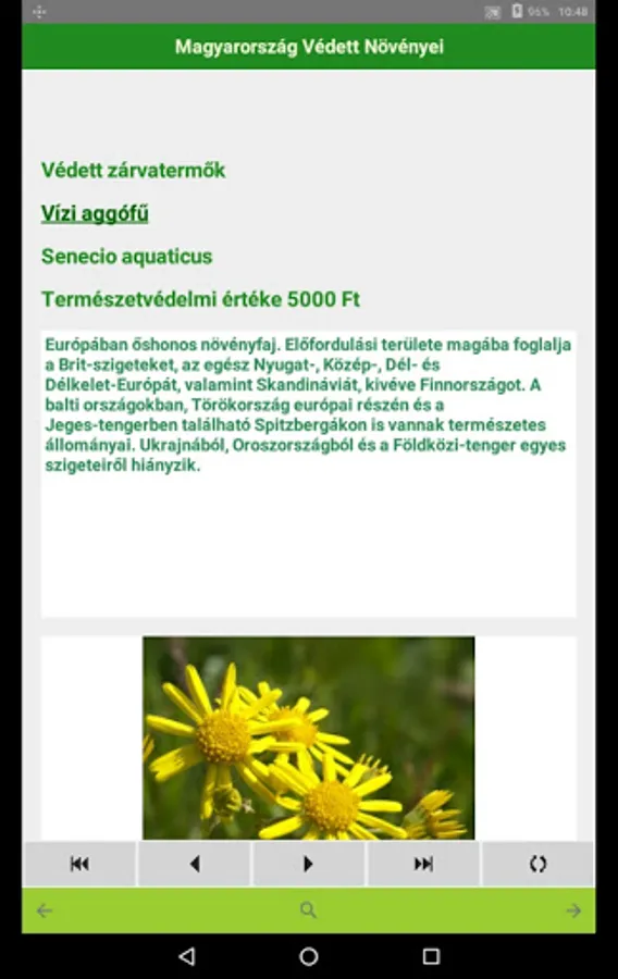 List of protected animal species and plants in Hungary with their detailed descriptions. It contains the Hungarian and Latin names of the species, their taxonomic classification, and a detailed description illustrated with a photo.