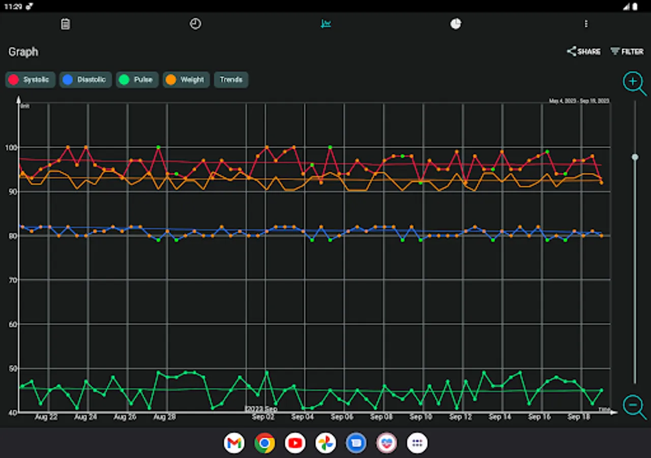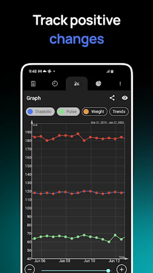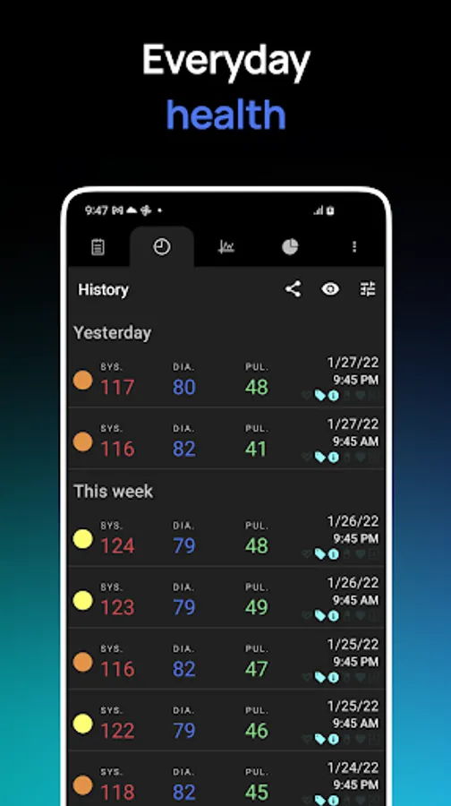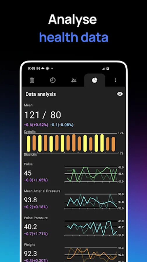★ Appearance Customization: Choose between Light and Dark themes and personalize colors for systolic, diastolic, pulse, and weight values, catering to all users, including those with color vision impairments.