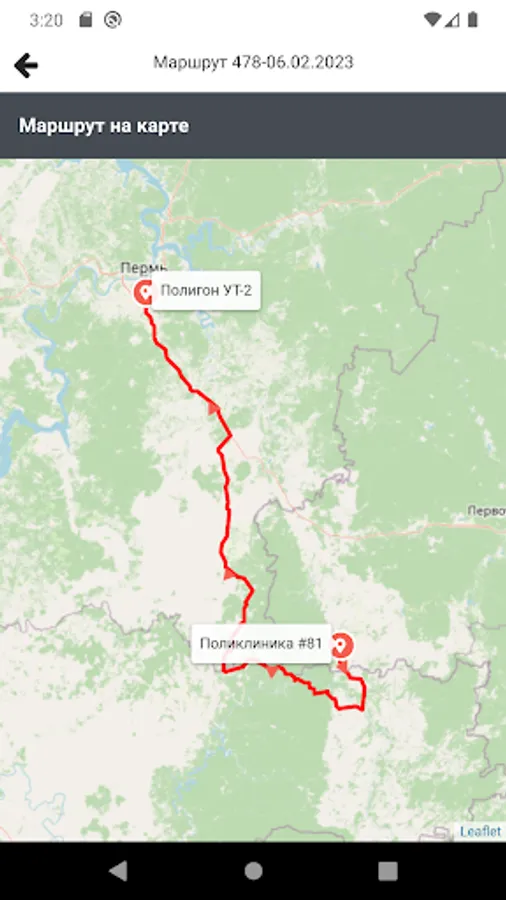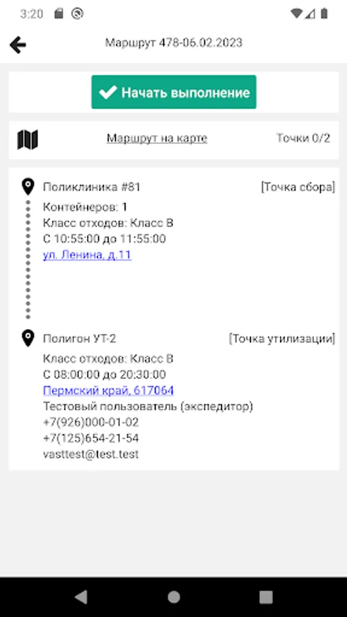 2. Display of detailed information about the route: a list of waste collection and disposal points,