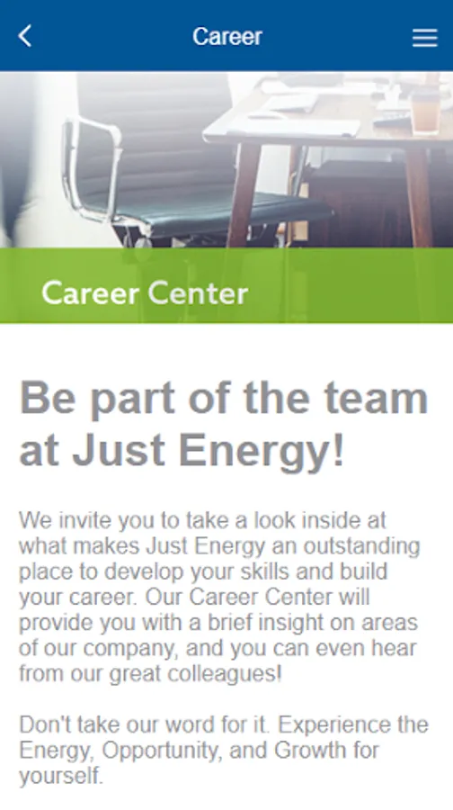 Welcome to your Just Energy app! Our app is built to empower our work life experience. The Just Energy app provides an “easy button” for Just Energy communications, career opportunities, benefits, key contacts and other resources to easily navigate everything you need in one place.
