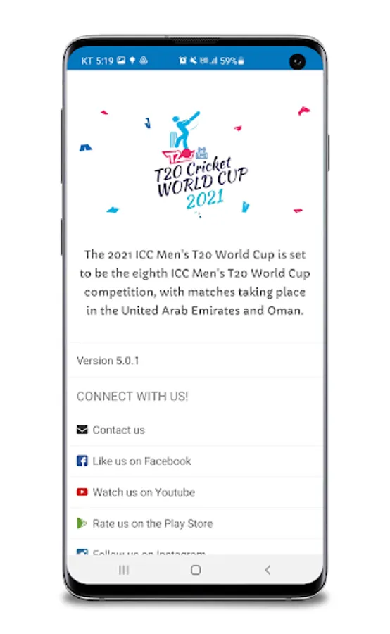 DISCLAIMER: This is not an official app of the T20 World Cup 2021 and is not affiliated in any way with the ICC. This application's content is freely available in public domains. For any type of content removal request, please contact us via our developer email; we will investigate your concern and take action as soon as possible.
