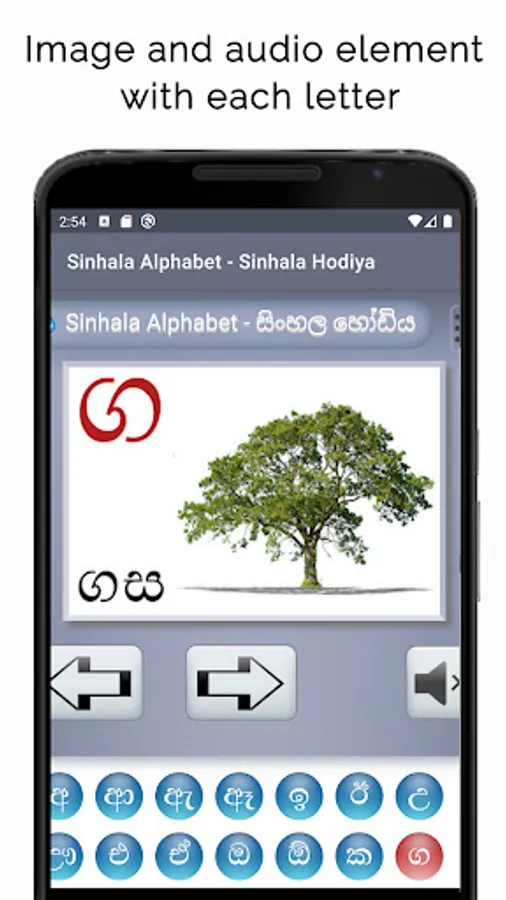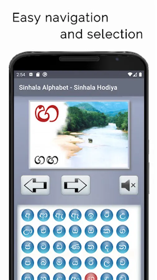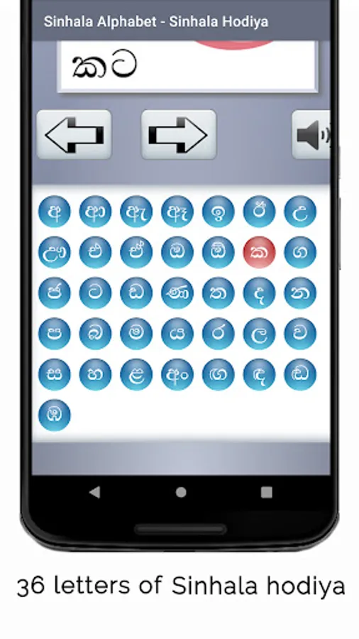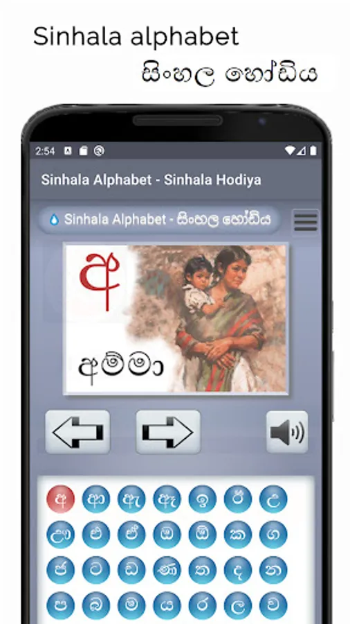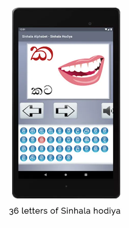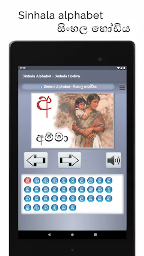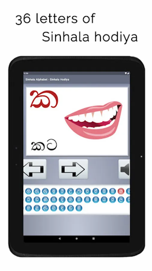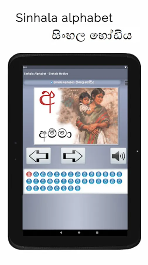 Introduction to the alphabet of the Sinhala language (an official language of Sri Lanka). The selected character set, comprising of 36 letters is generally recognised as fundamental to learning the Sinhala script. An audio element of the letter and an associated word with image will also accompany the selection of each letter.