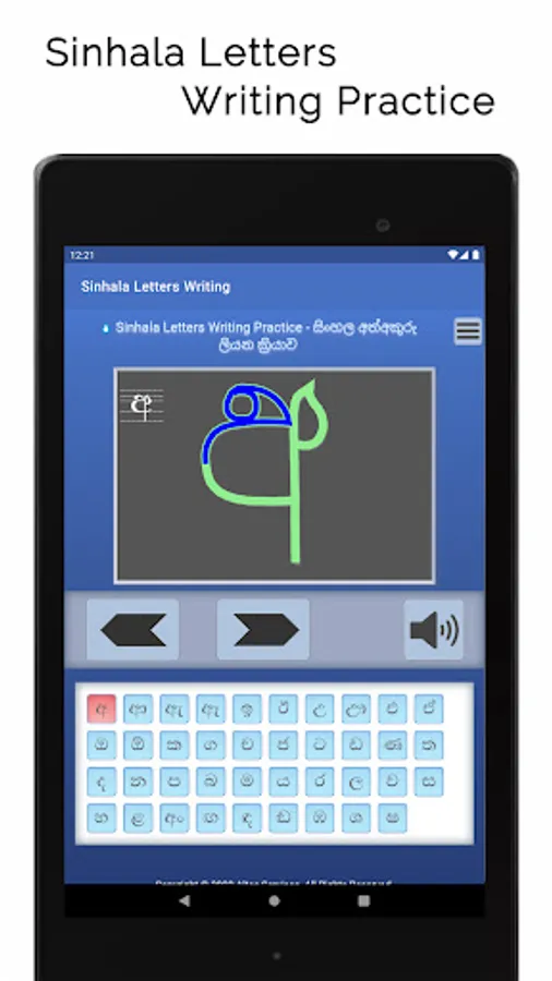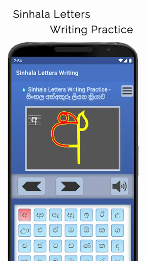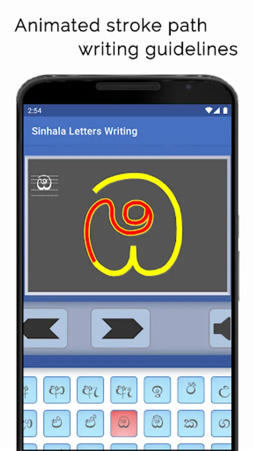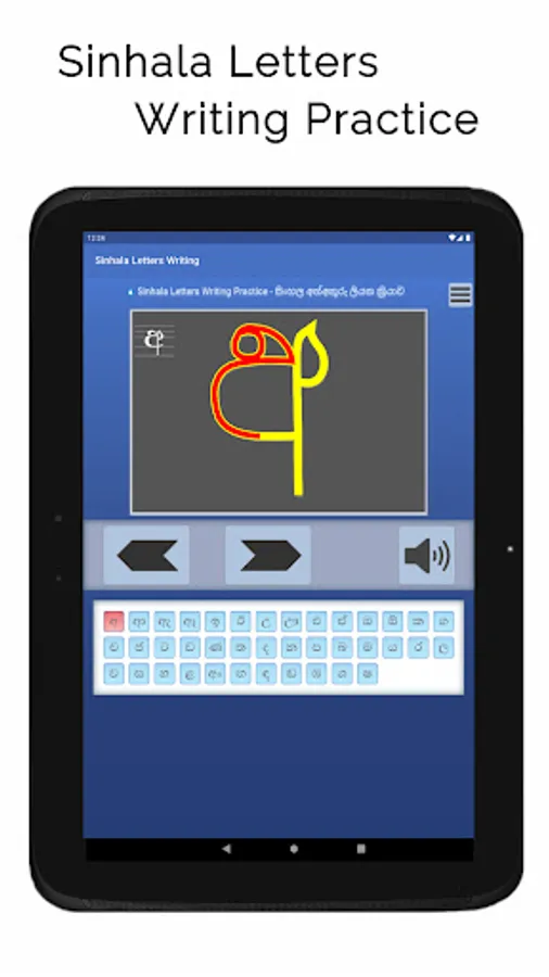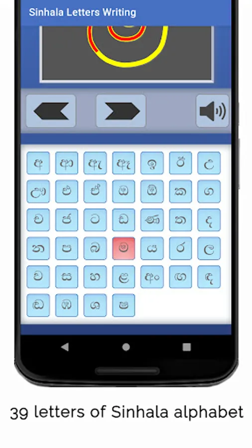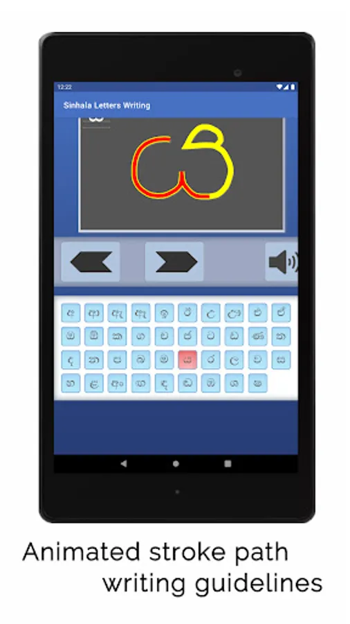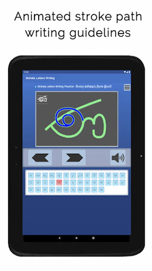 Sinhala Letters Writing app shows how letters in the Sinhala alphabet are written. Sinhala is an official language in Sri Lanka. On screen animation follows the sequence of strokes typically used to write each letter. The 39 letters presented in the app could be considered as the most commonly encountered letters in Sinhala texts.