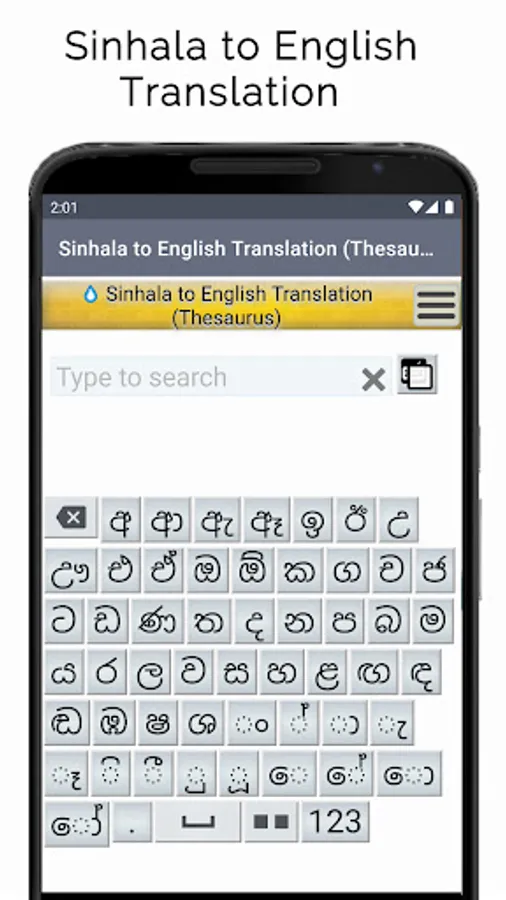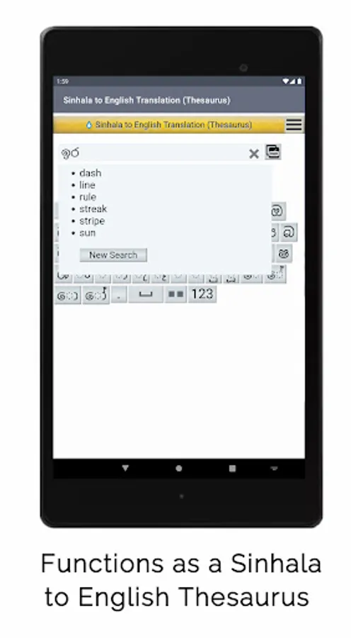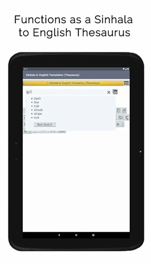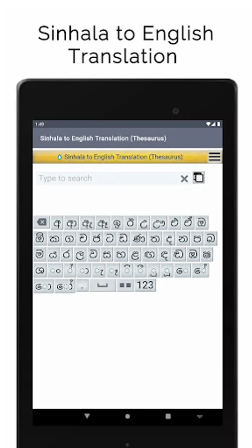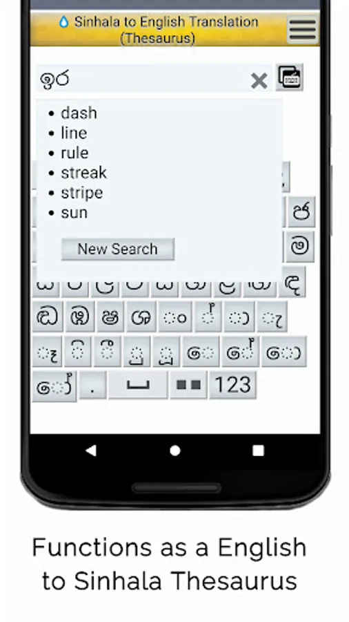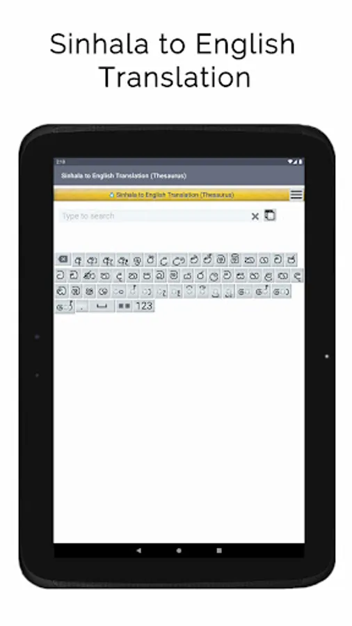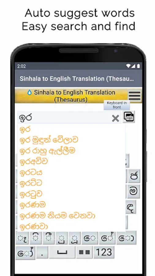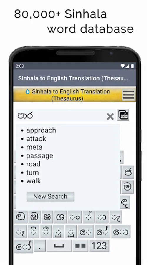 Sinhala to English Translation app allows you to find English synonyms (words of same meaning) to particular Sinhala words. It has an on screen Sinhala keyboard that contain all Sinhala hodiya as well as Misra Sinhala letters. Apps auto suggest feature enables you to find words quickly and efficiently. The app functions more like a Sinhala to English thesaurus rather than a Sinhala to English dictionary or Sinhala to English translator. The database contains 80,000+ Sinhala words and their English translations.