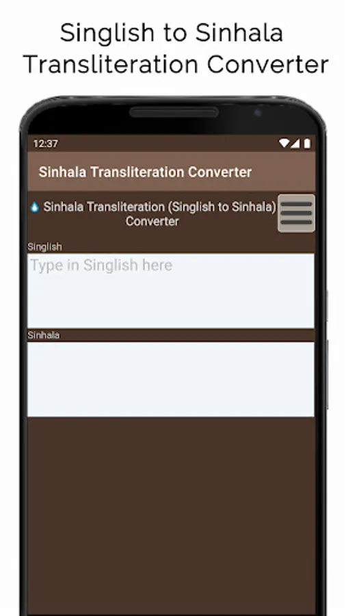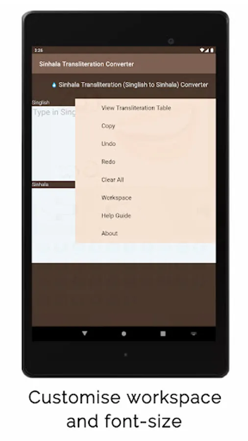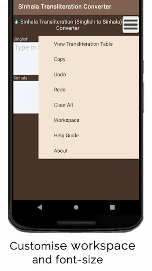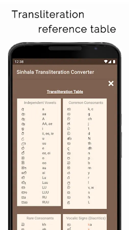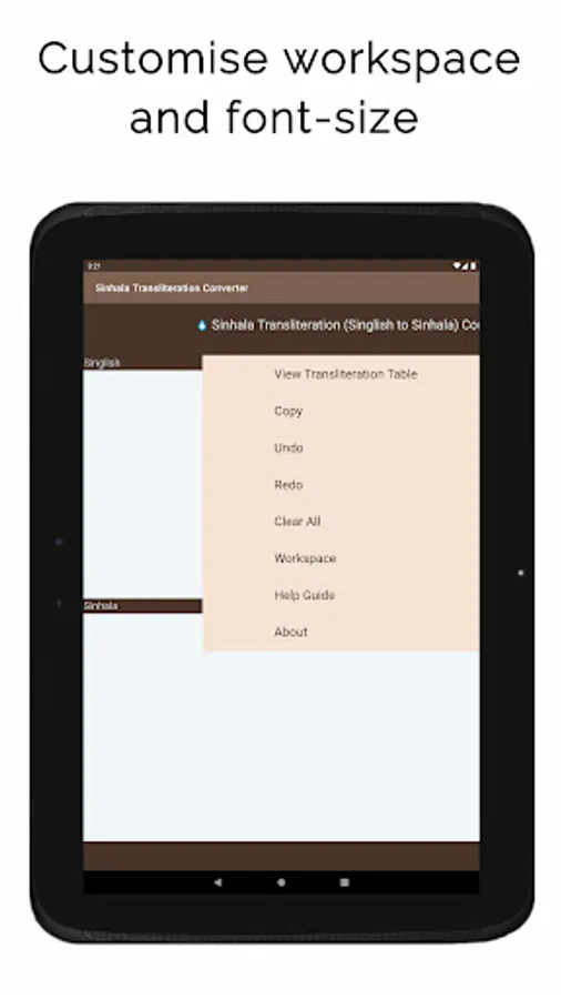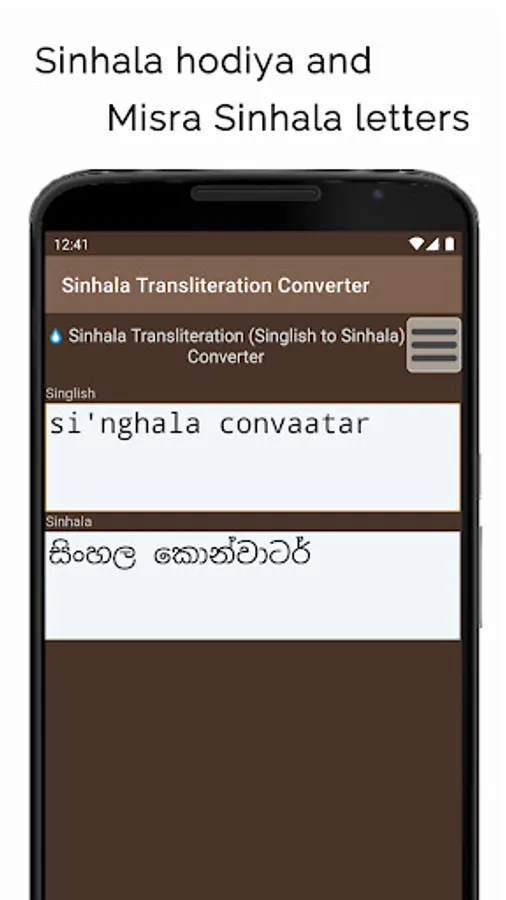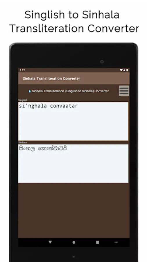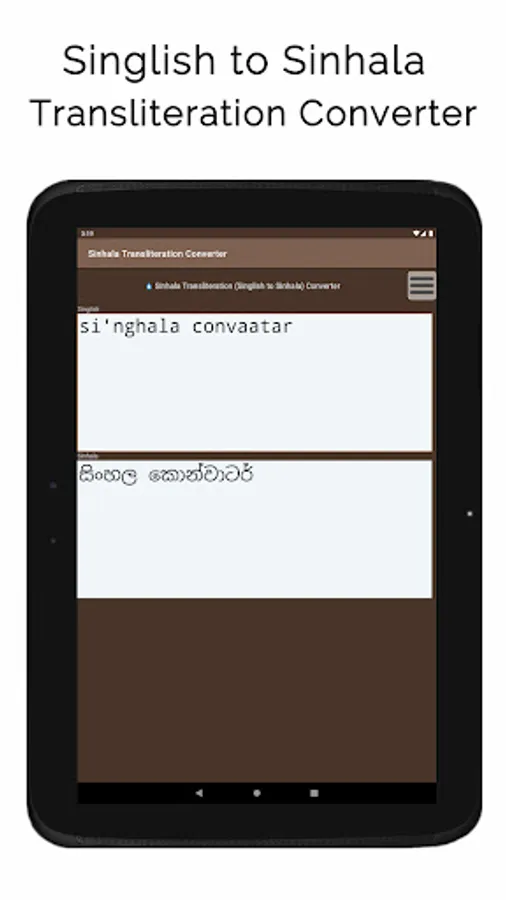 Sinhala Transliteration (Singlish to Sinhala) Converter app converts text typed in English letters (Singlish typing) to their phonetically equivalent letter/s in Sinhala (i.e. Singlish to Sinhala converter). The Singlish to Sinhala conversion can be done in real time as you type or can be pasted from the clipboard in to the app. Transliteration (i.e. English/Sinhala letter association) is comprehensive as it presents effectively all letters Sinhala alphabet (including Misra Sinhala letters). You do not require to memorise a Sinhala keyboard layout as needed when typing in Sinhala using standard keyboards.