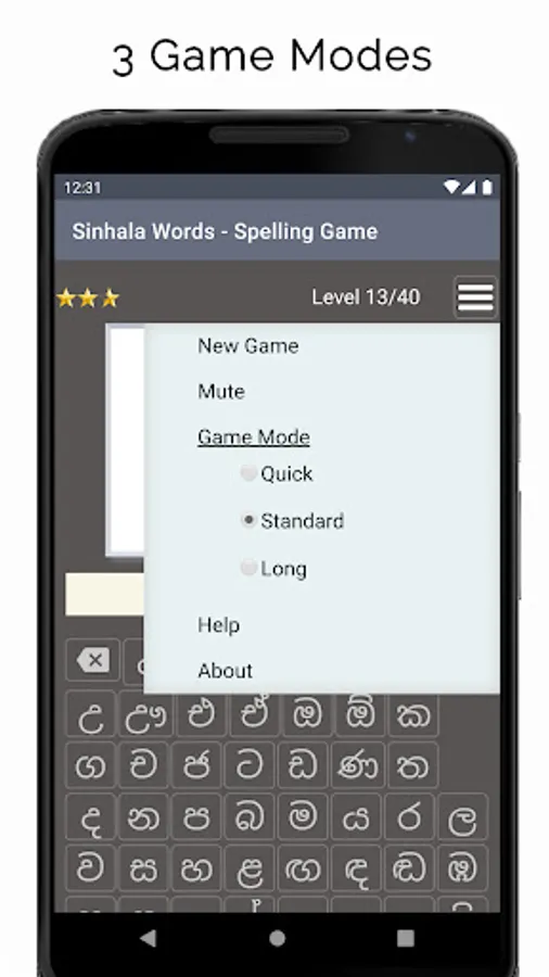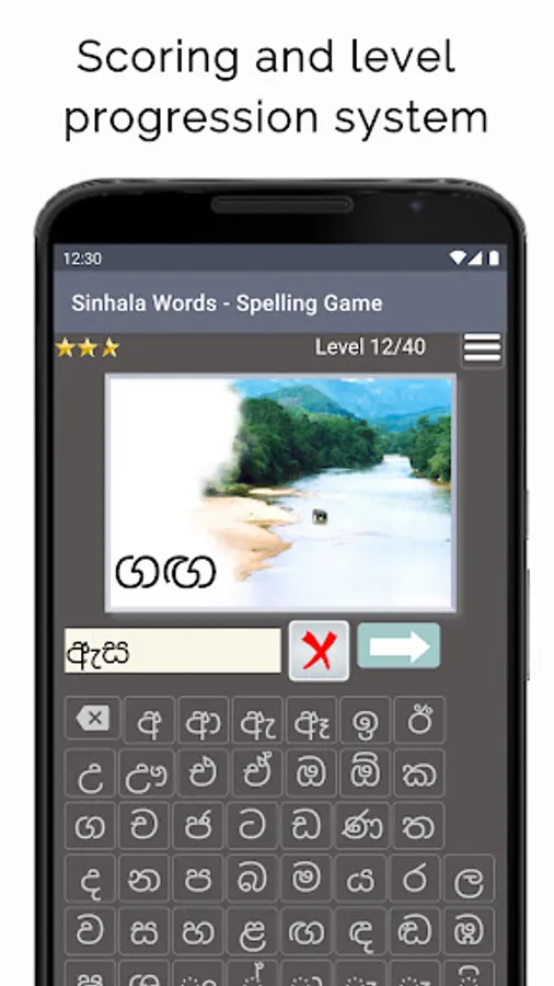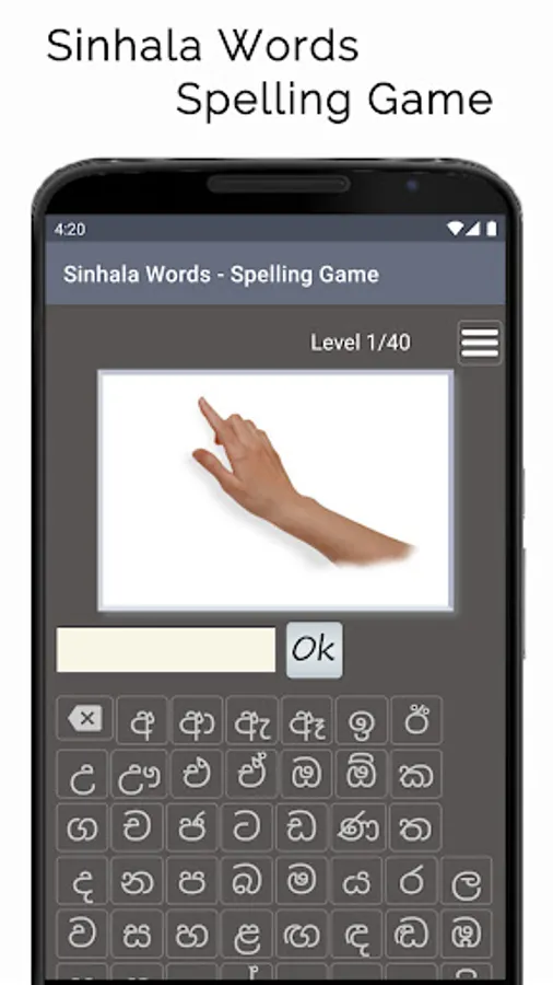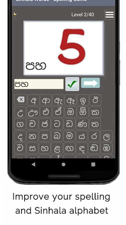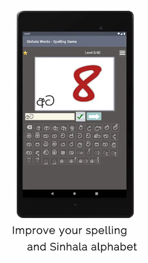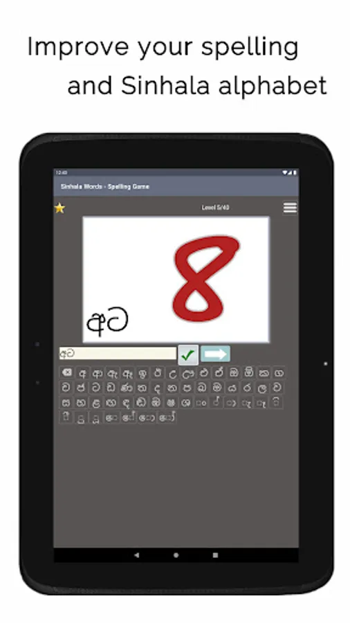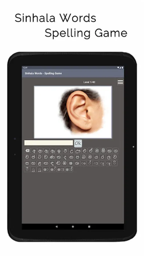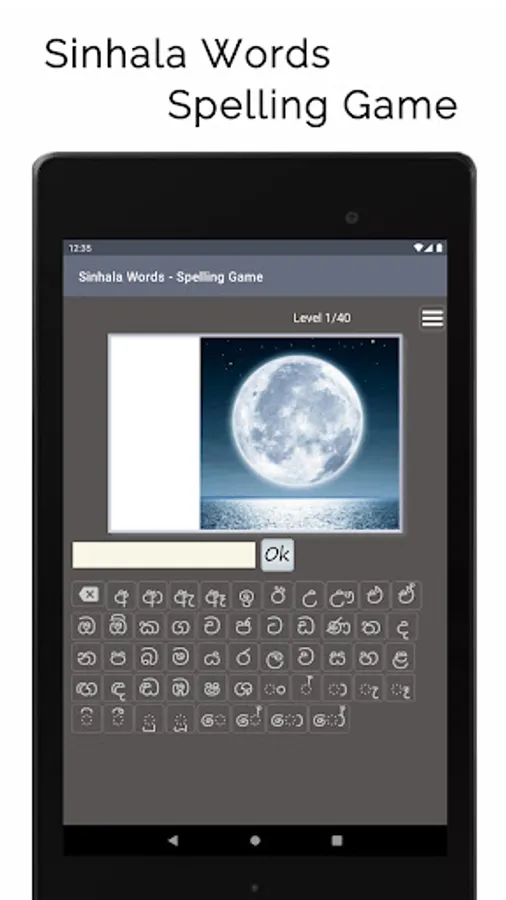Sinhala Words - Spelling Game was developed as an interactive tool to help you improve your spelling of Sinhala words and to enhance your knowledge of the Sinhala alphabet. The app is designed in the form of the simple game, with a scoring and level progression system. The objective of the game is to spell the Sinhala word of the image that appears on the game screen. If you spell the Sinhala word correctly you get a certain score. The difficulty of the game increase as you progress through the levels.