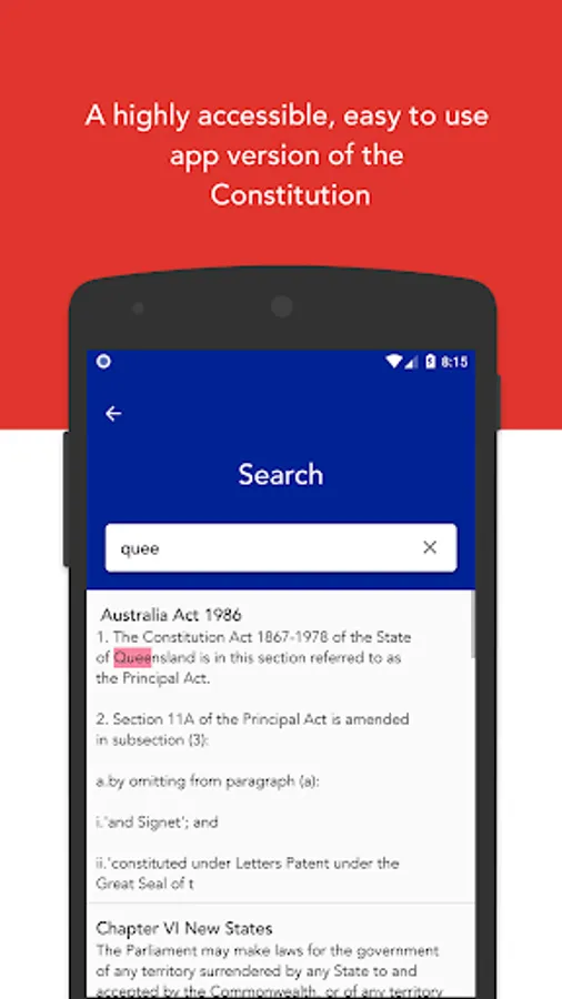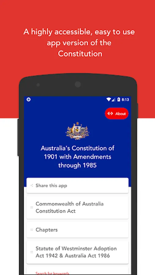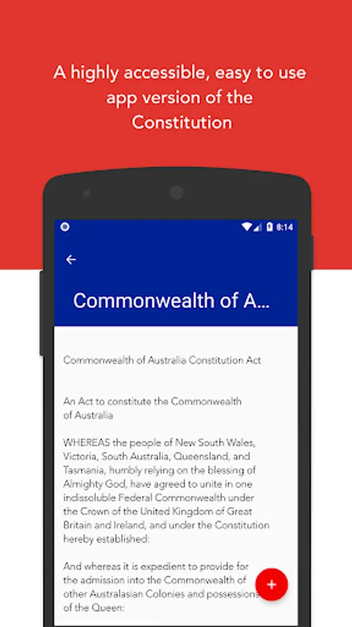 The Australian Constitution provides the basic rules for the government of Australia. This app contains the full text of the Commonwealth of Australia Constitution Act including but not limited to content from the official revised reprint dated 1st January 2012.