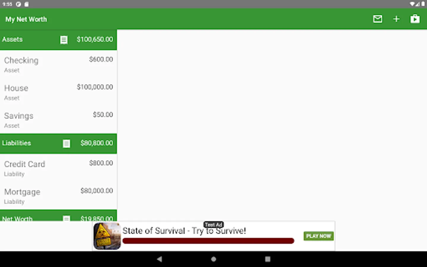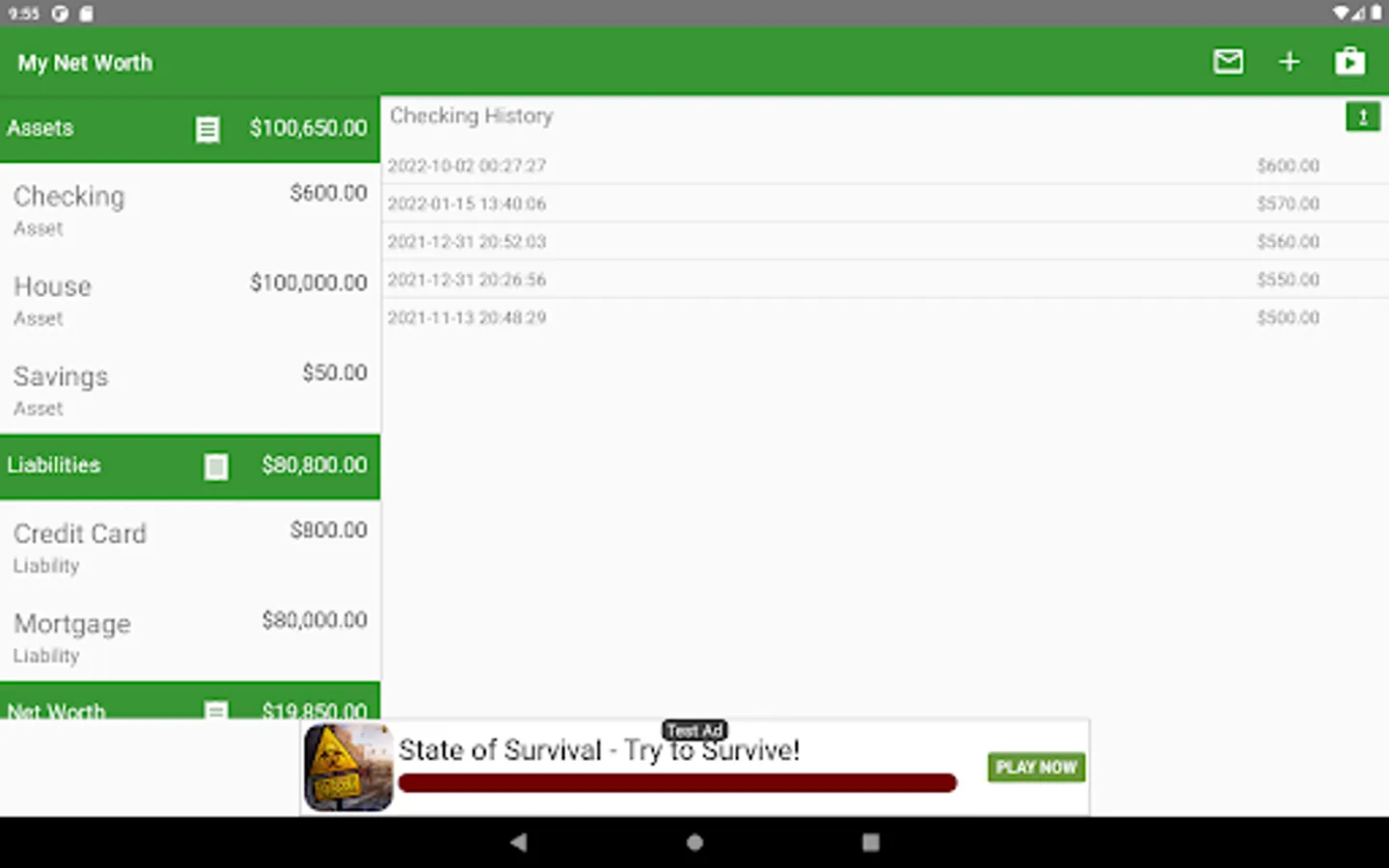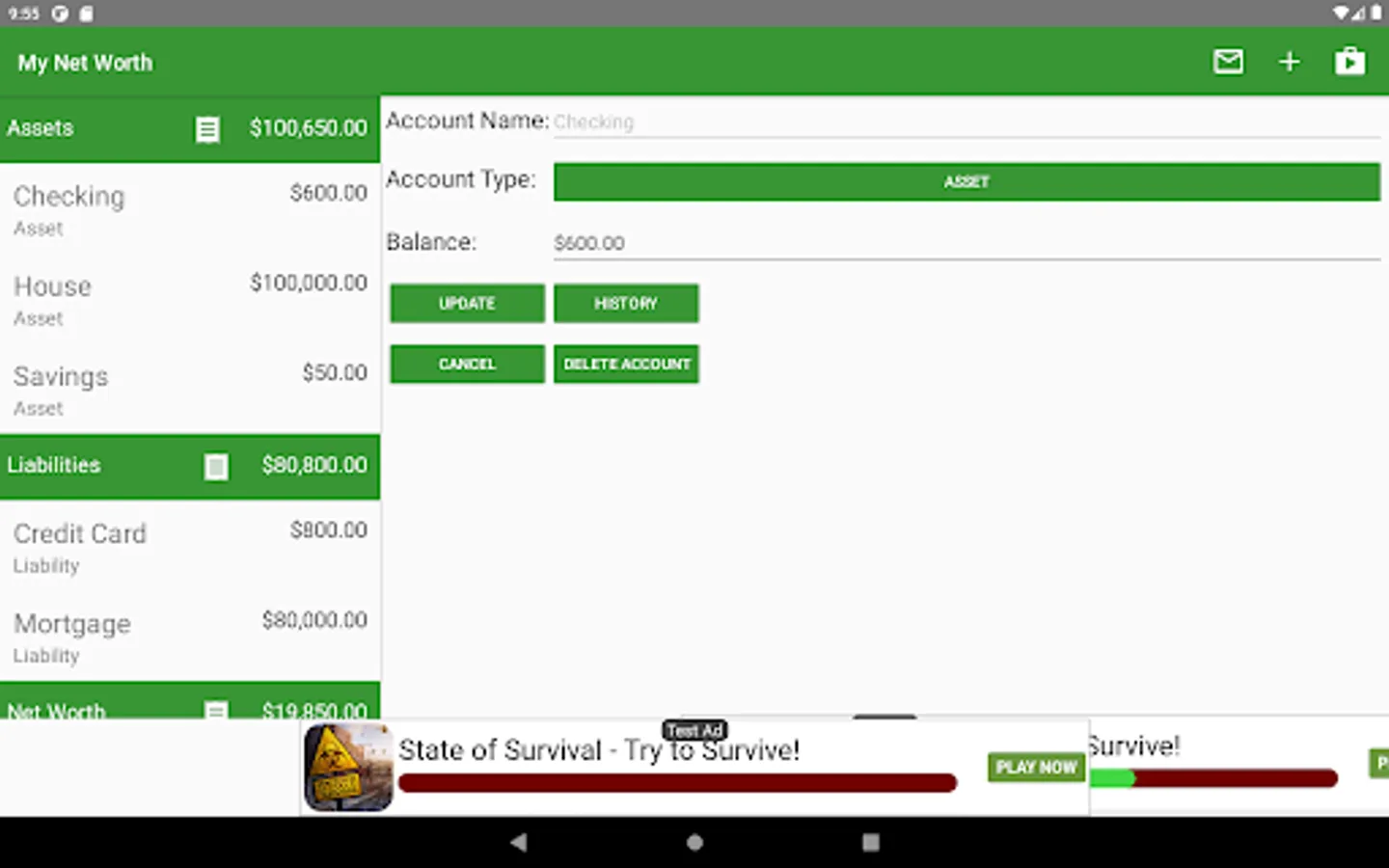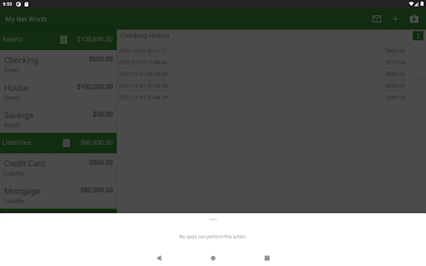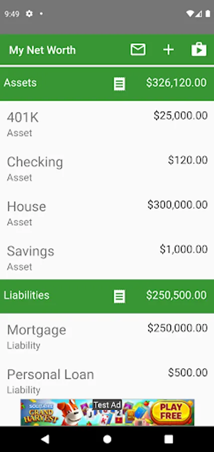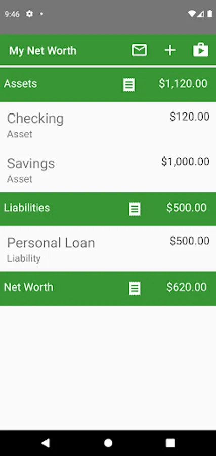 This application allows users to keep track of their net worth with screens that allow you to quickly update information. You can use this application to keep track of your money as you spend it, and to view the history to see how the account has changed over time.