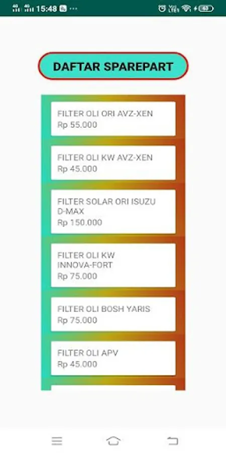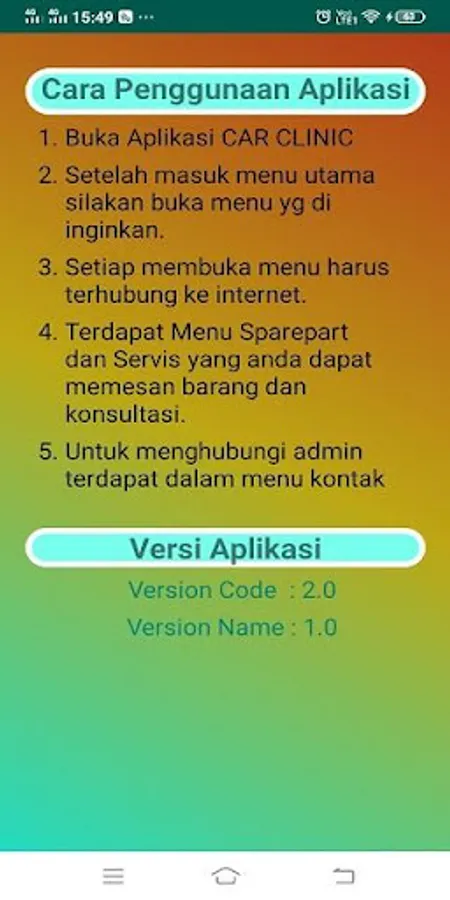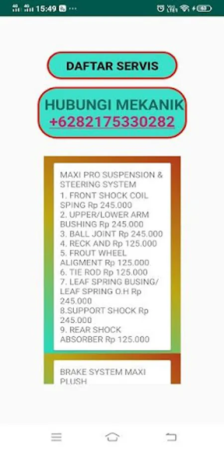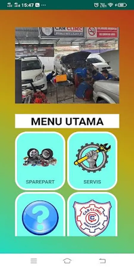 This application can be used for the sale of spare parts and car service outside the workshop area. which contains a menu of spare parts, service, help and contacts.