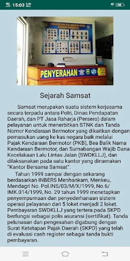 Samsat is an integrated system of collaboration between the National Police, the Provincial Revenue Service, and PT Jasa Raharja (Persero) in the service of issuing vehicle registration and motorized vehicle registration numbers associated with the entry of money into the state treasury either through Motorized Vehicle Tax (PKB), Return Fees The name of the motorized vehicle, and the mandatory contribution of the Road Traffic Accident Fund (SWDKLLJJ), and carried out in an office called "Samsat Joint Office".