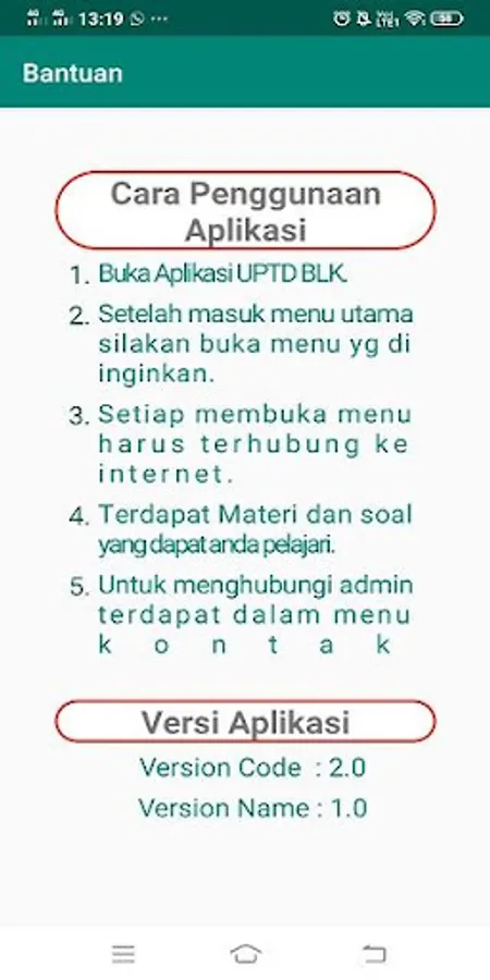 this application is an application that is used as teaching material in the training department at UPTD BLK Baturaja. Which contains modules, questions, tutorials, galleries, help and agency profiles.
