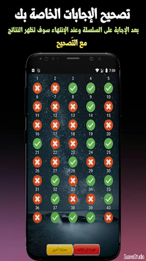 - عند الإنتهاء من الإجابة على السلسلة المكونة من 40 سؤالا يظهر لك التطبيق النتيجة المحصل عليها مع الأ جوبة الصحيحة و الخاطئة .