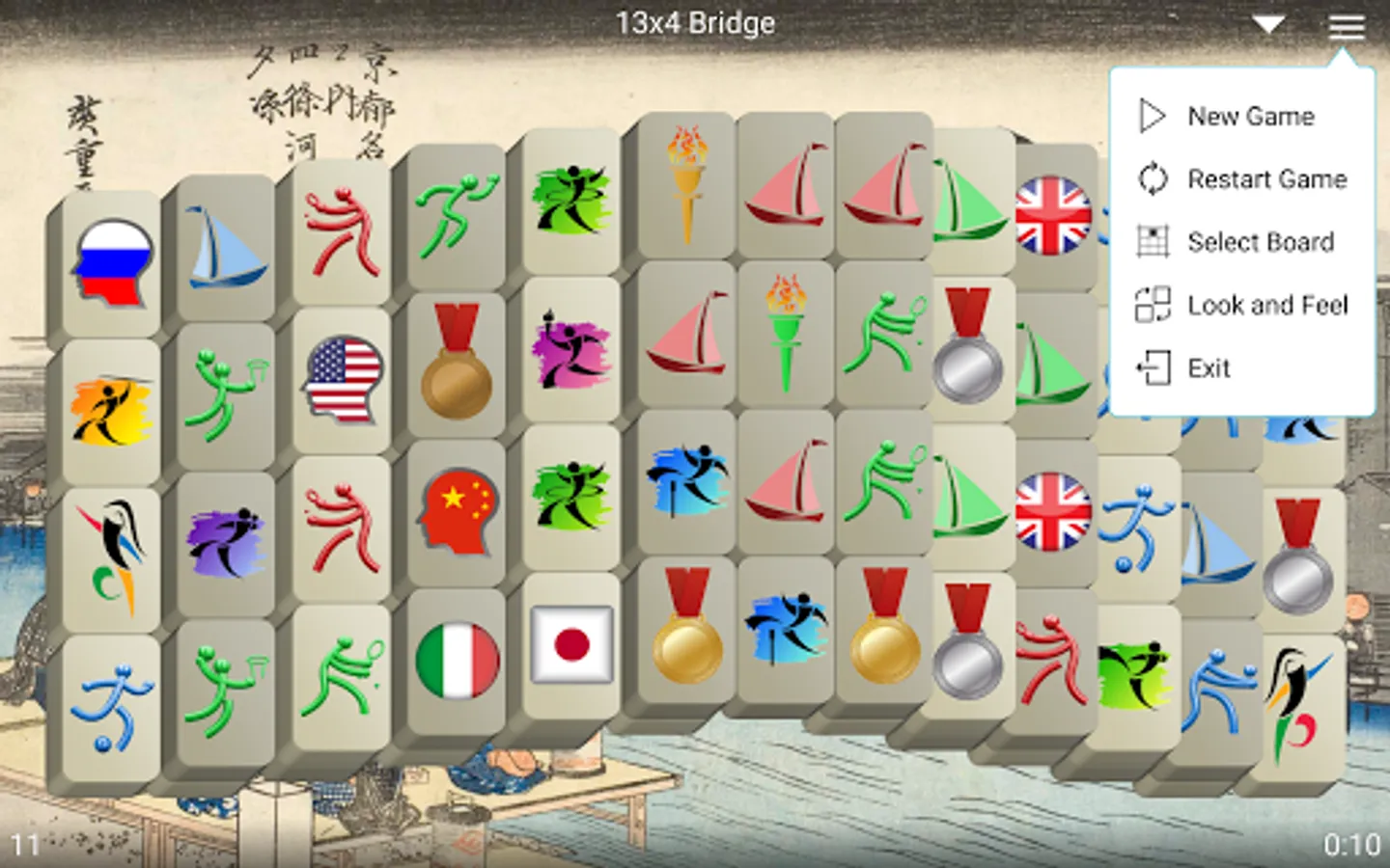 ShisenSho, sometimes known as 'Four Rivers', is a single-player, tile based board game, where the objective is to remove all tiles from the board.