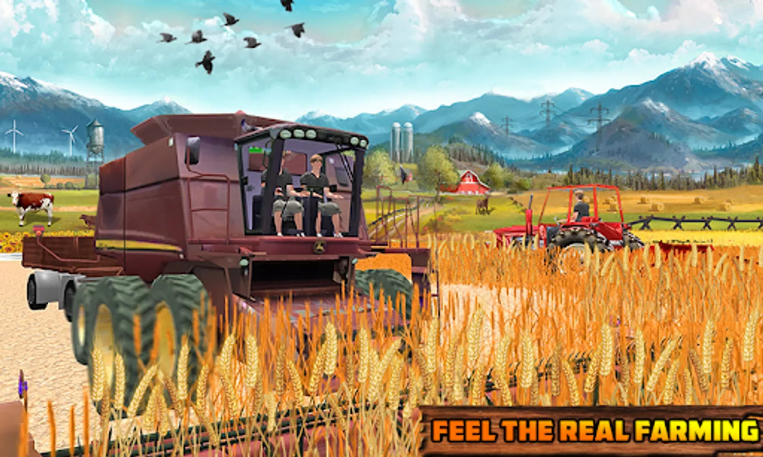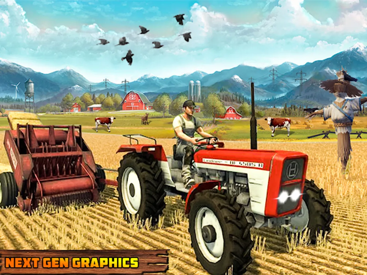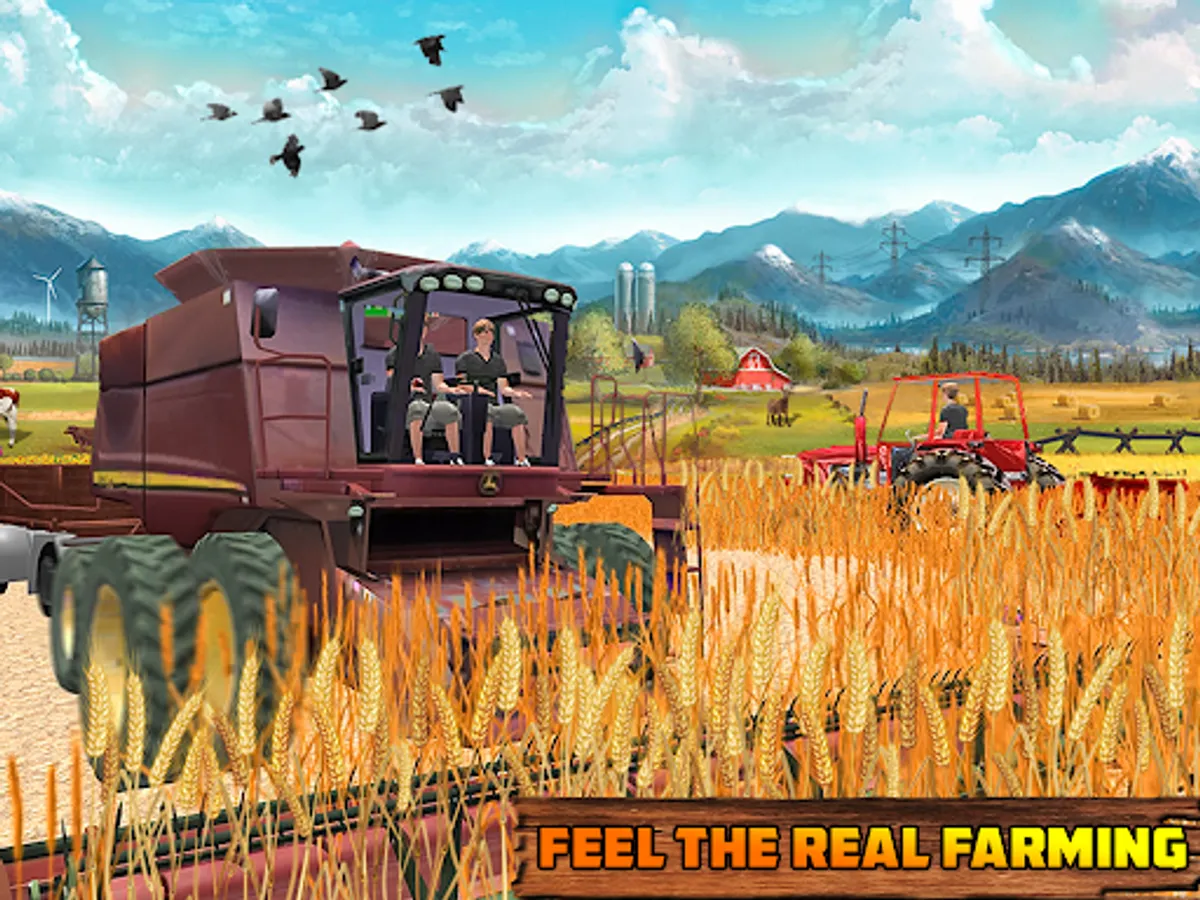 This farmer sim offers to drive real modern farming vehicles like tractors, cultivators, harvesters, plow machine, seed machine, water spray machine like a real new farmer do, also having horse carts driving sim. Your pet animals in your animals farms near grind mill will wait for food. Transport it in your cart to feed cows and goats.