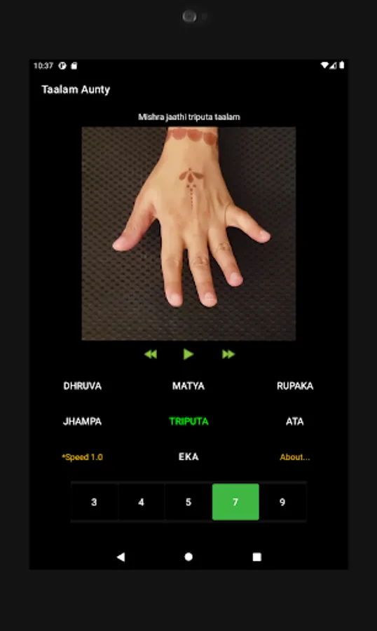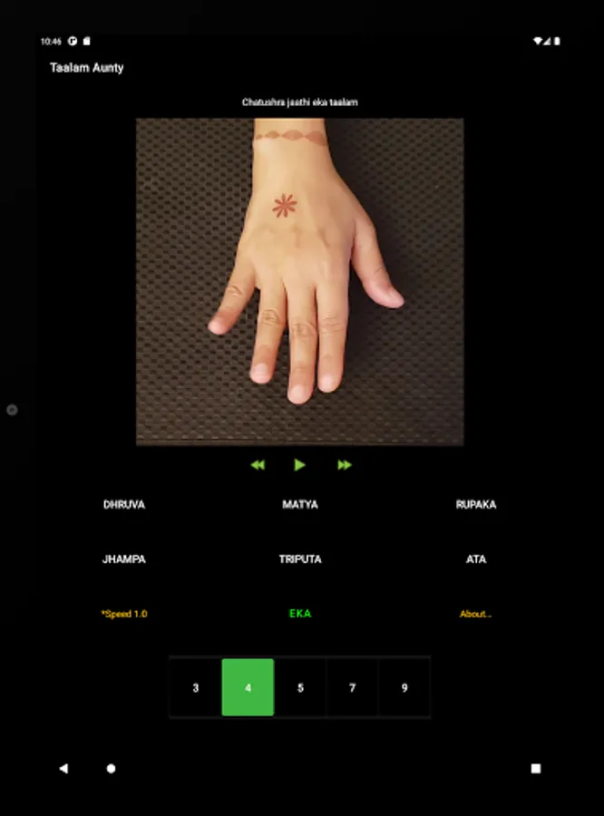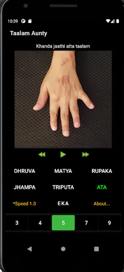 Taalam is Sanskrit for Rhythm. This app can be useful for Carnatic musicians whenever a visual rhythm reference is needed. The basic seven Taalams of Carnatic music are built into this app, along with five Jaathi variations (3, 4, 5, 7, 9). Select the desired Taalam, Jaathi and press the green play button. The Taalam video will play in a loop for as long as the app runs. Speed can be adjusted with the arrows next to the play button. We hope this app is helpful in your musical journey.