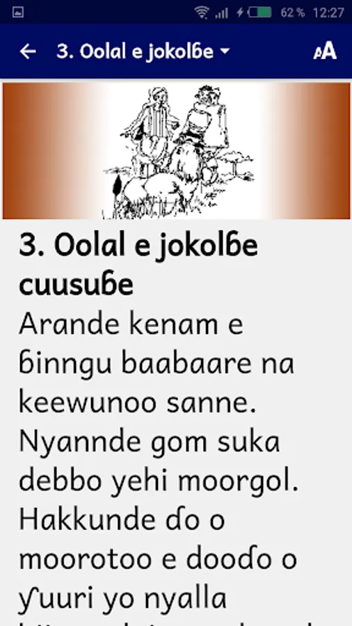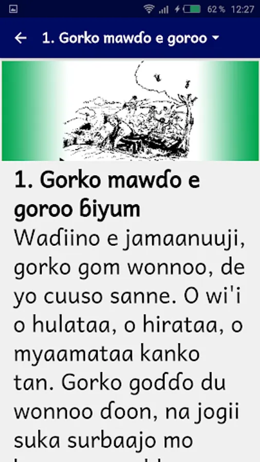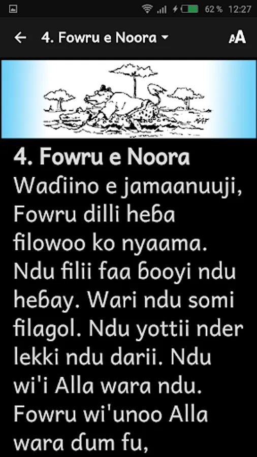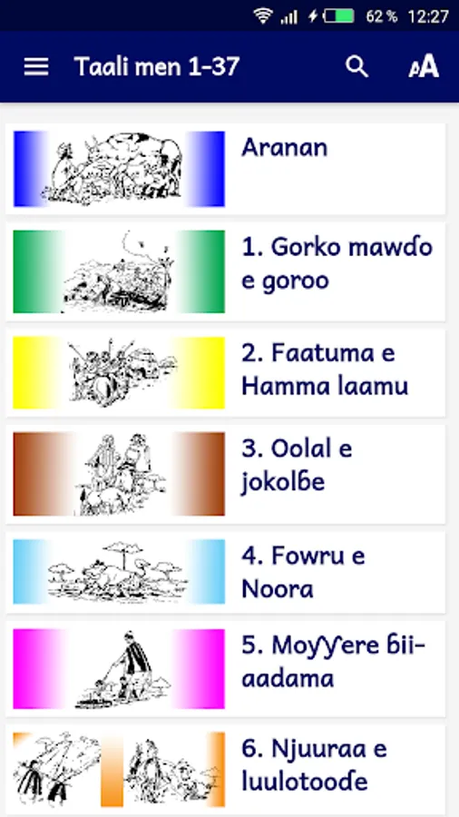 This app offers you thirty-seven (37) fulfulɗe tales, collected in Burkina Faso. The tale, is more particularly the mirror of the society, it emphasizes the mentalities, reveals the beliefs and values certain behaviors. First, the central theme highlights a problem or conflict within the community. For example, the tale exposes problems in relationships between co-wives. In the outcome, he proposes a solution to this problem. It's a real class of moral education. The tale provokes strong feelings among listeners and imposes moral standards. Hyena, for example, is greedy, dishonest, brutal and always fails in its dishonest actions. His rival, the hare is rather cunning, he always wins against the hyena. In the mirror tales, the two characters are in fact the two opposite aspects of the human person: good and evil. The characters that appear most often are the hare, the king / lion, the woman, the hyena, the orphan, the genius ...