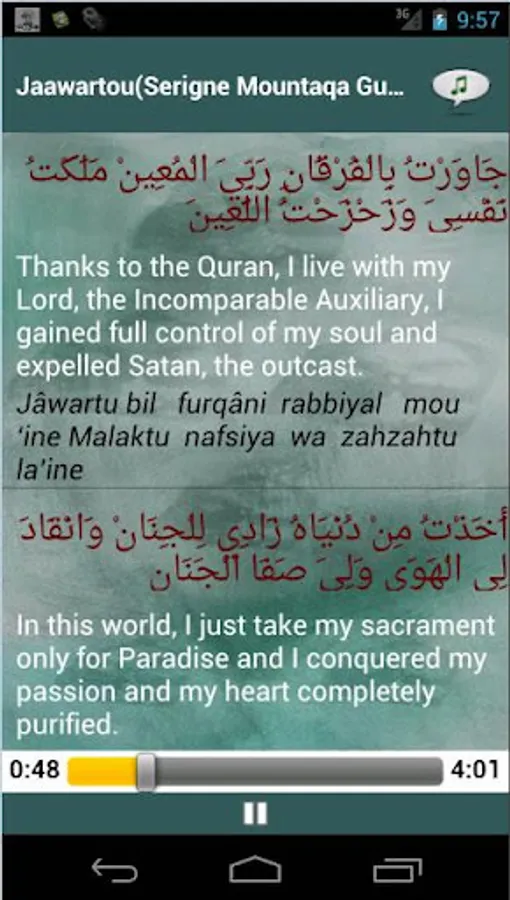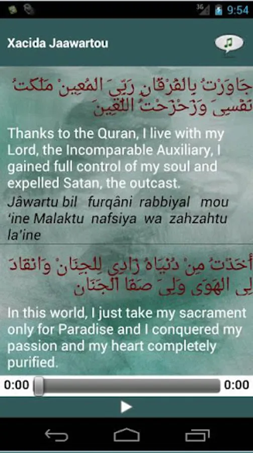 It includes pure Arabic text, the French and English translation (depending on the configuration of your smartphone or tablet), transcription and declamation of the latter by followers of Sheikh.