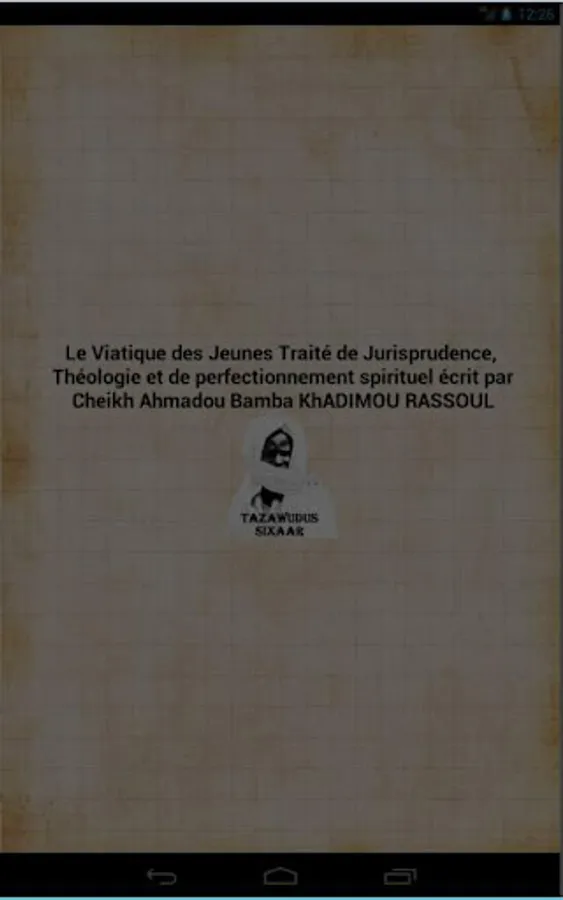 TAZAWUDUS-SIXAAR (Viaticum Youth) is a Treaty Law, Theology and spiritual development written by Sheikh Ahmadou Bamba Khadimou RASSOUL translated from Arabic into French by Serigne Mbaye Sam (RTA)