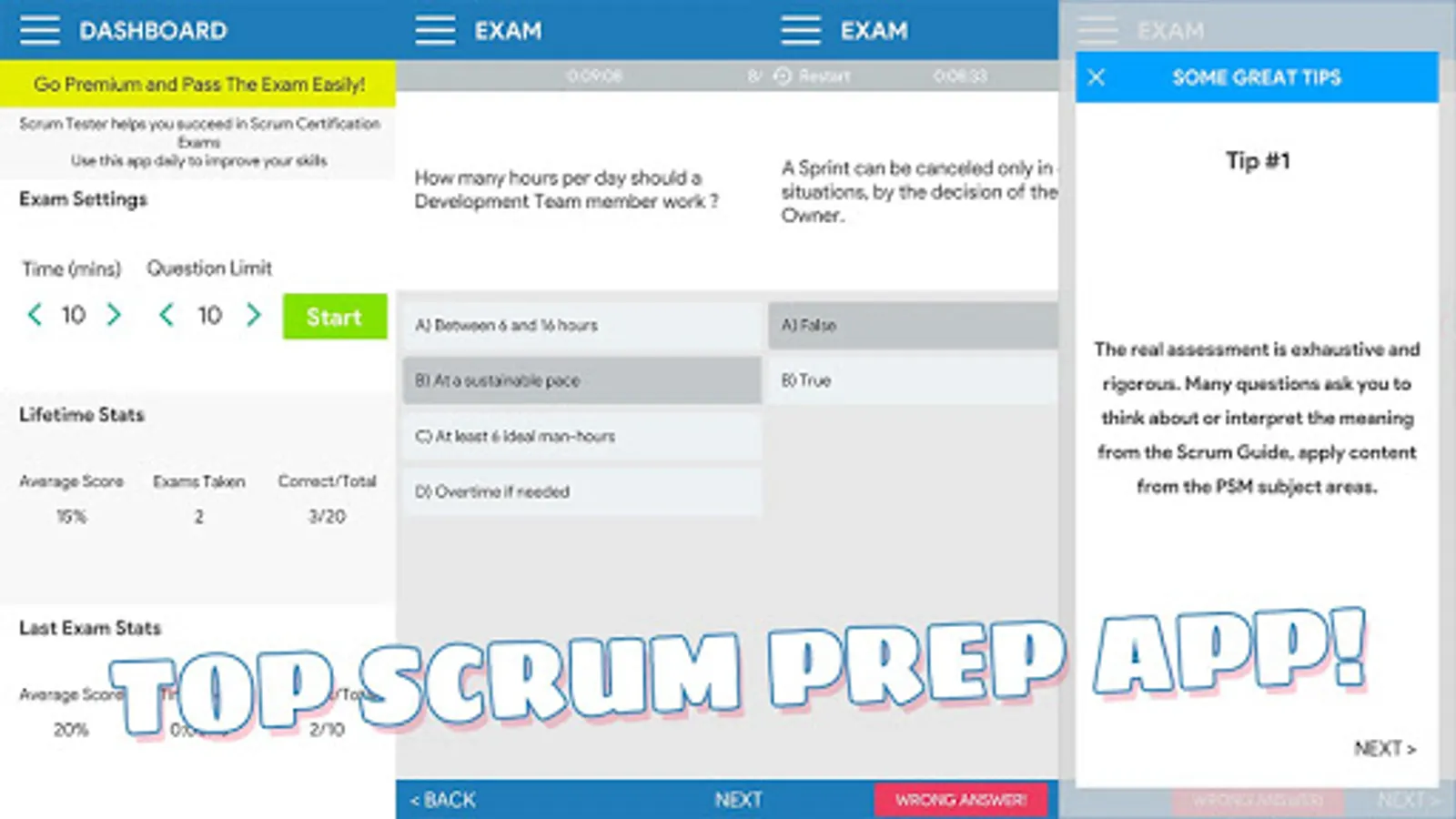 The scrum framework booklet is only 16 pages long but the real exam is tougher than you think. You need good practice before taking the PSM exam or CSM exam; otherwise, you may lose money. This application is designed to make you a successful Scrum master.