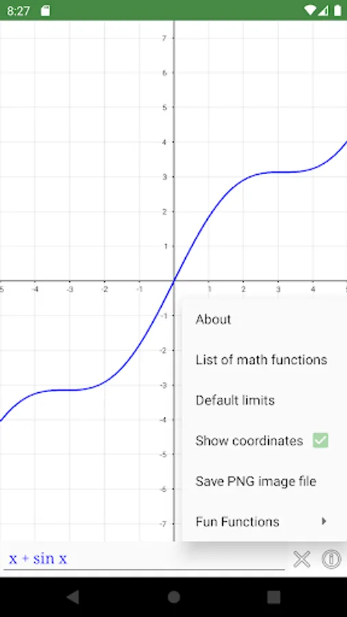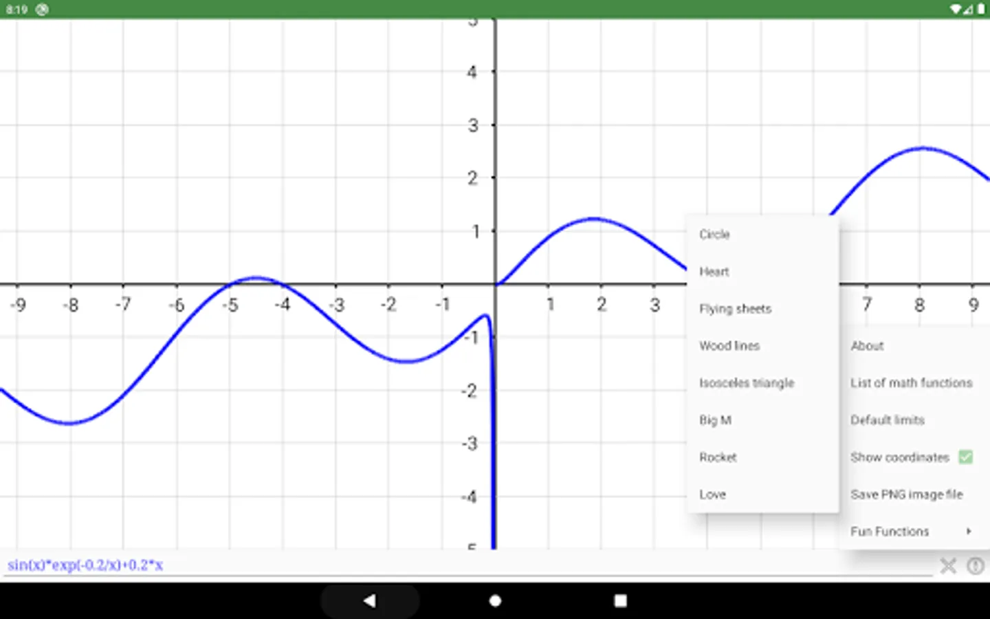 Grapher Lite is another demonstration of the fact that math is fun. It is a simple function grapher that utilizes math functions to draw nice figures. In a single line, compose freely a series of at most 10 functions of a single variable (x), separated by a semi-colon “;” and press enter to plot them. You may then export the drawn figure to a PNG image file. The mathematical format used for expressing functions is similar to that used in spreadsheet applications. Only difference is that an expression like -x^2 is treated as (-x)^2 instead of -(x^2). It is recommended to employ braces to avoid confusion. Different standard math functions are included (please have a look at the list of math functions).