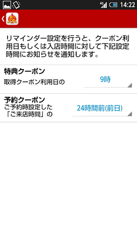 取得したクーポンをアプリに入れておくと、設定した時間にリマインド通知します。