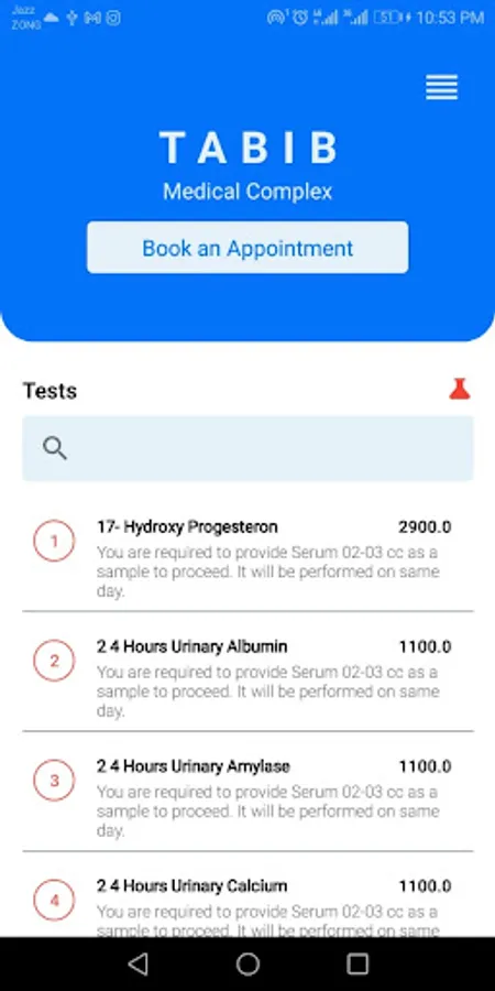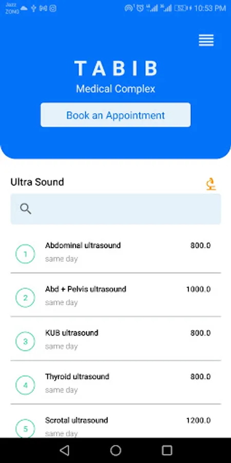 You can find all types of Ultrasounds we do in TMC along with their prices. The app have a complete list of test we practice them in TMC Laboratory along with their prices
