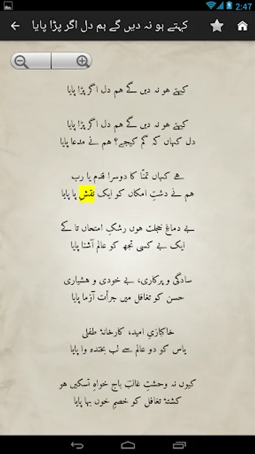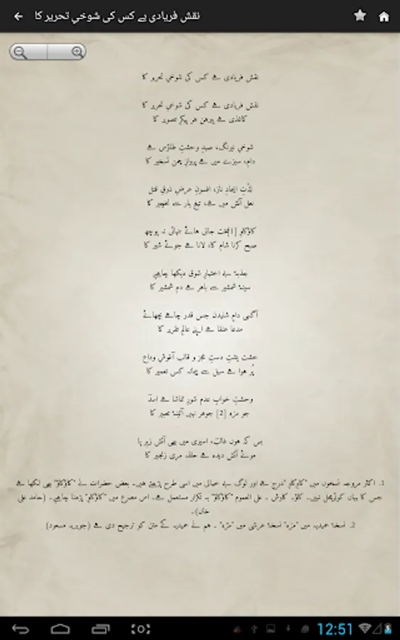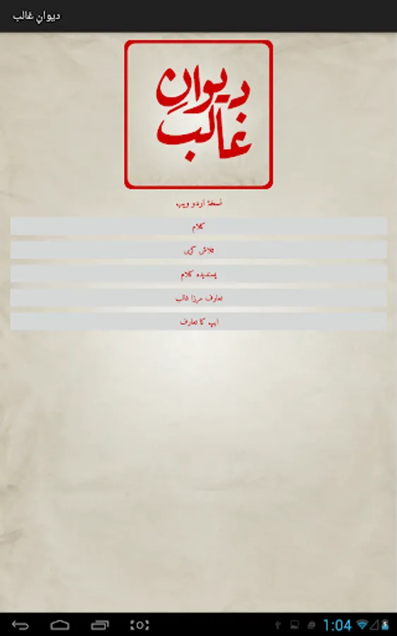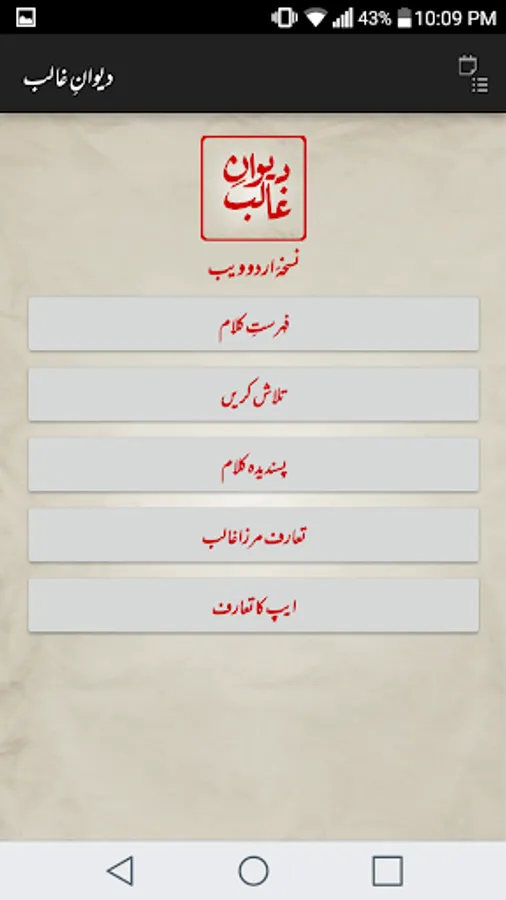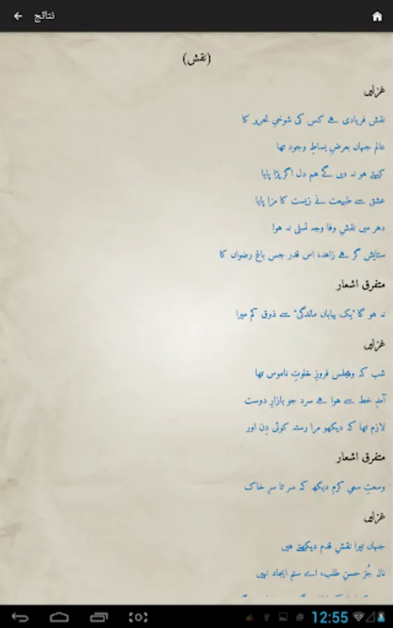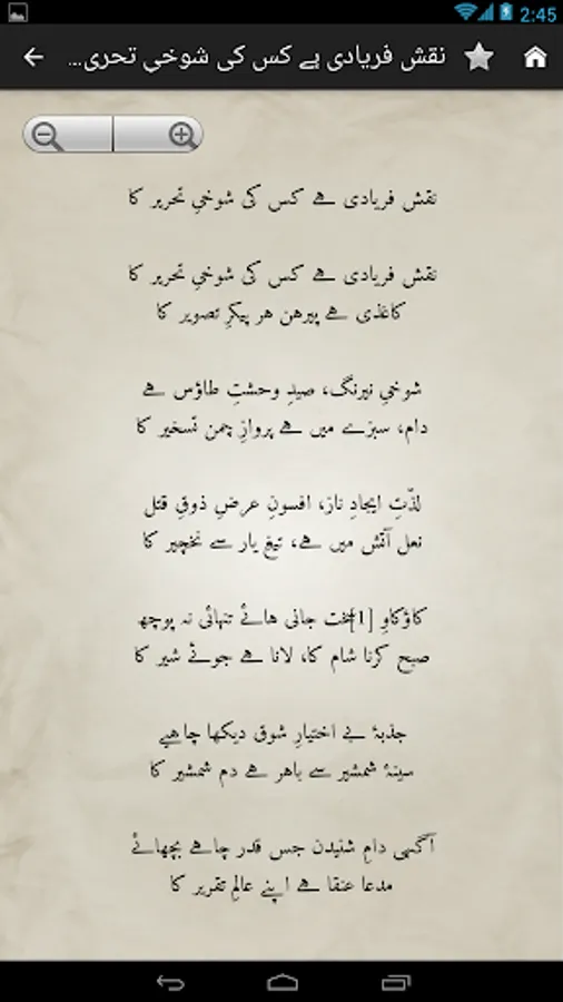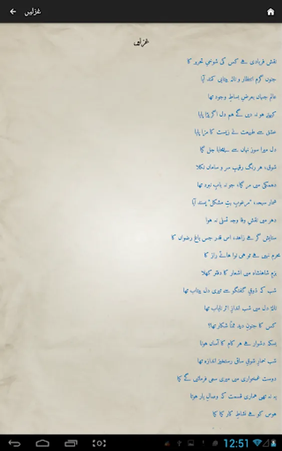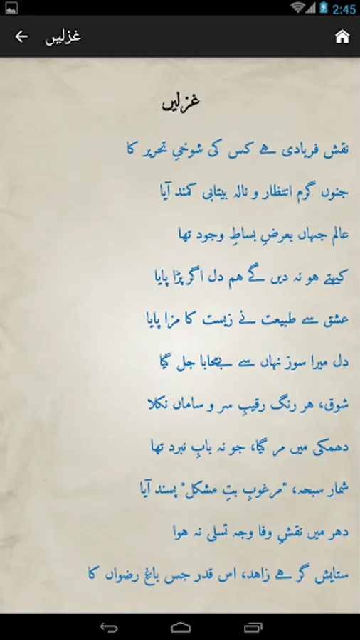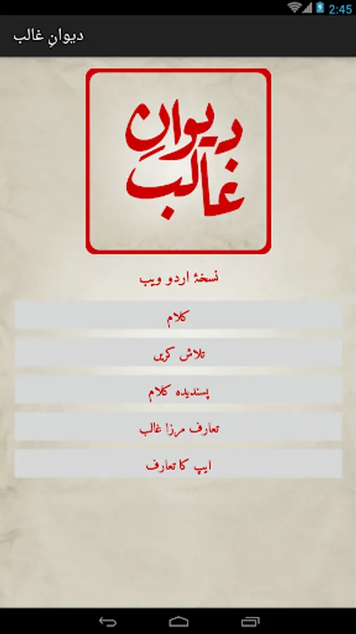 Complete Urdu poetry of famous Urdu poet Mirza Asadullah Khan Ghalib in urdu text (deewan-ghalib by urduweb). Any urdu word can be searched in poetry. Application is offline. User can copy text of any poem.
