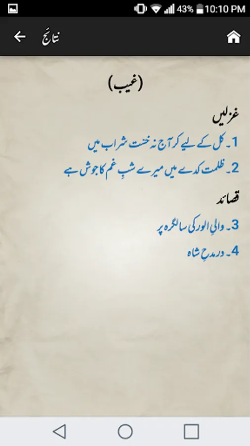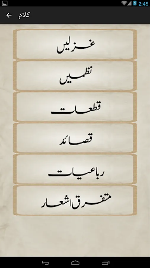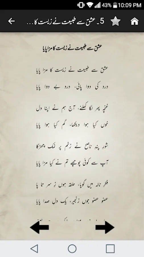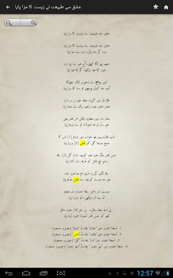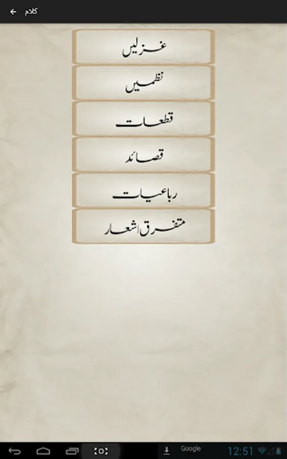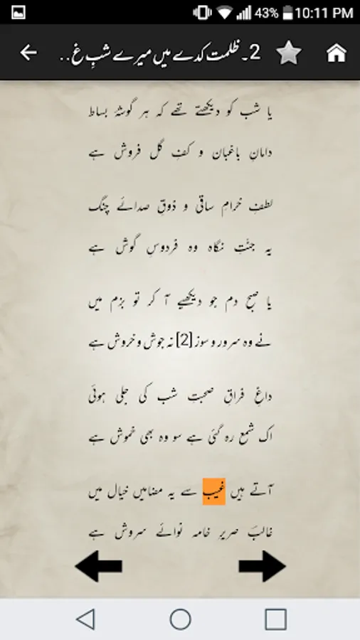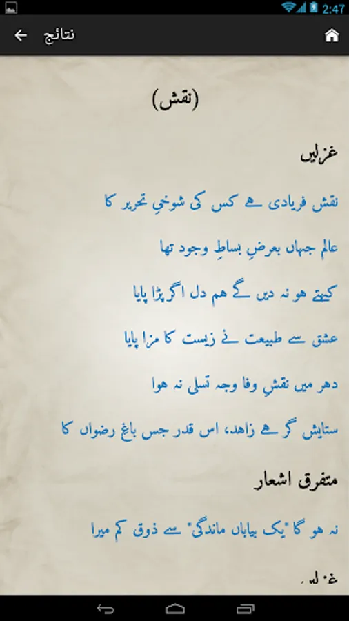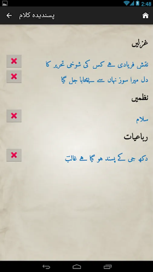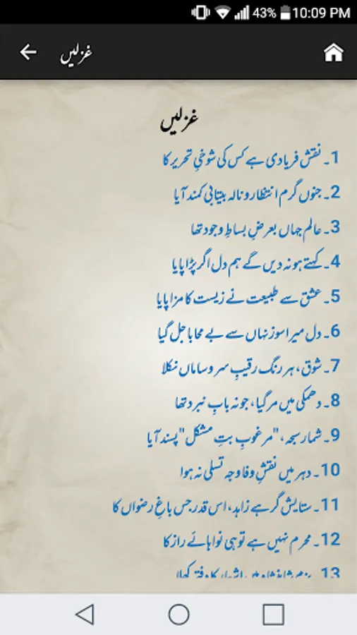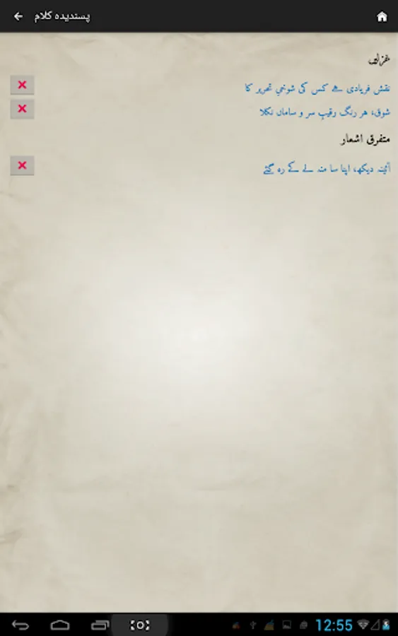 Complete Urdu poetry of famous Urdu poet Mirza Asadullah Khan Ghalib in urdu text (deewan-ghalib by urduweb). Any urdu word can be searched in poetry. Application is offline. User can copy text of any poem.