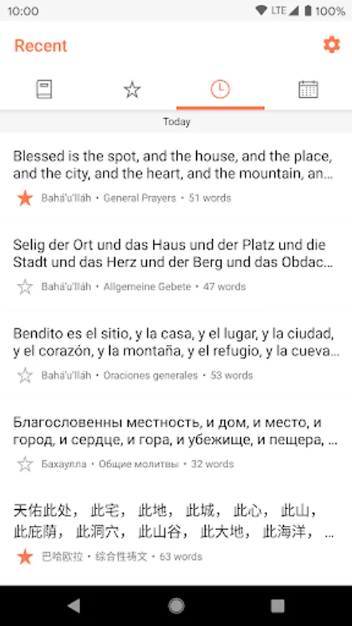 Prayers from Bahá’u’lláh, the Báb and ‘Abdu’l-Bahá are offered in English, Deutsch, Español, Esperanto, Français, Gourmanché, Italiano, Kiribati, Magyar, Polski, Português, Română, Svenska, Русский, 简体中文, 日本語, فارسی and عربي.