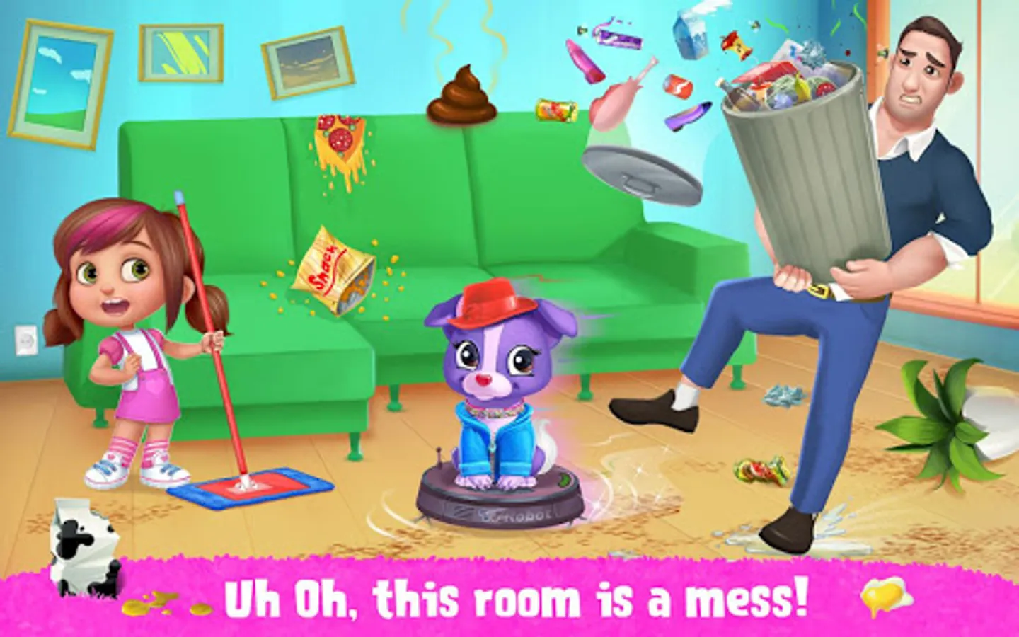 Uh oh, this house is a mess! Time for some serious house cleaning! Can you take care of Daddy & help organize the house before Mommy comes home? Do the laundry, take care of the puppy, clean the messy toilet & more! Don’t forget to leave Mommy a loving note on the fridge! Helping around the house is pretty crazy (especially when Mommy's not home!), but house cleaning with Daddy is also so fun!