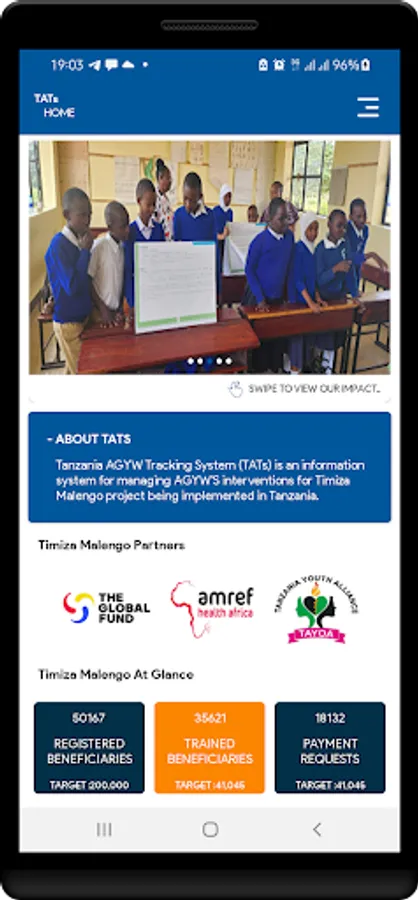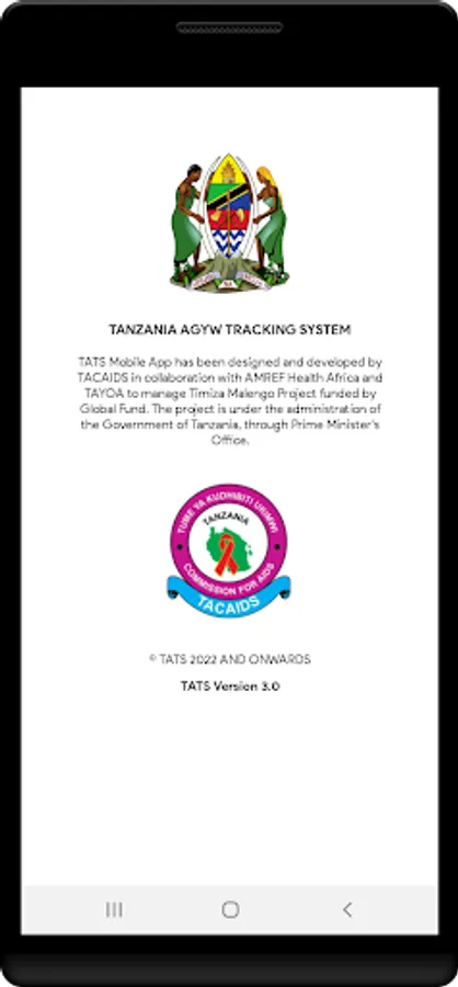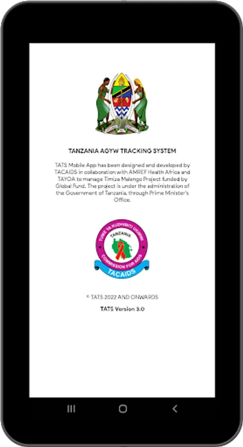 TATS Mobile App has been designed and developed by TACAIDS in collaboration with AMREF Health Africa and TAYOA to manage Timiza Malengo Project funded by Global Fund. The project is under the administration of the Government of Tanzania, through Prime Minister's Office.