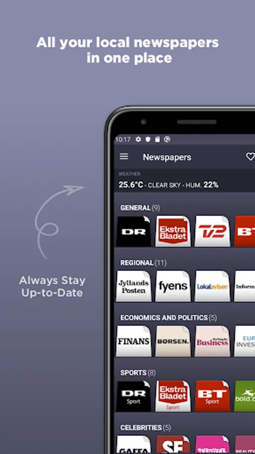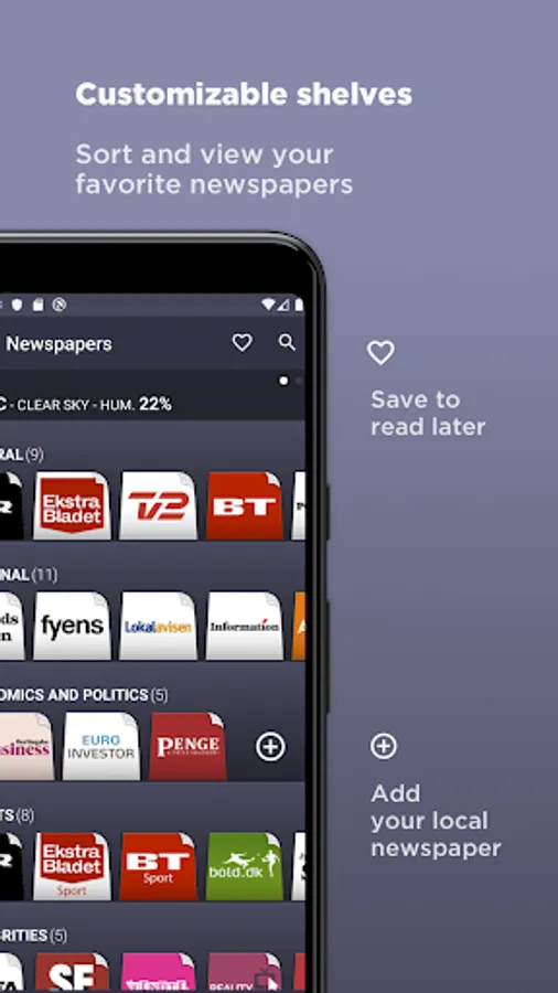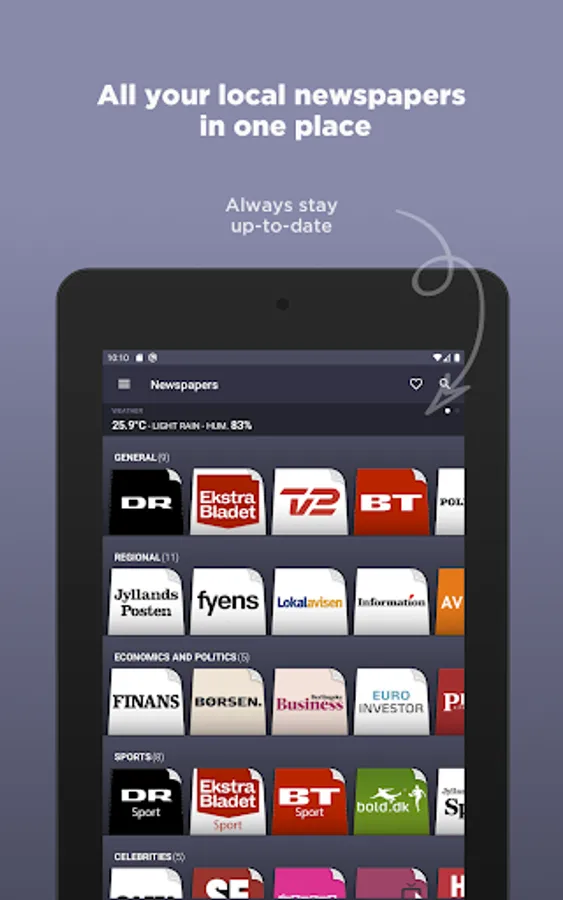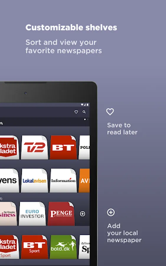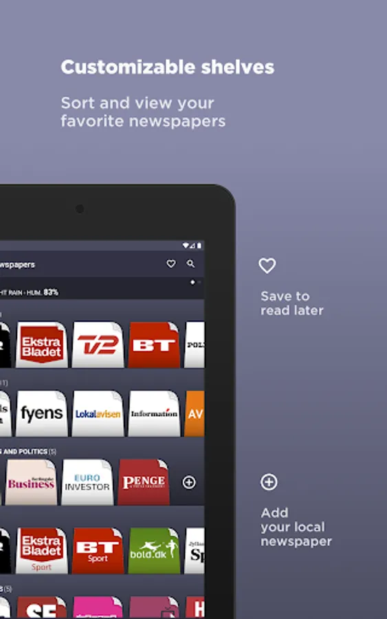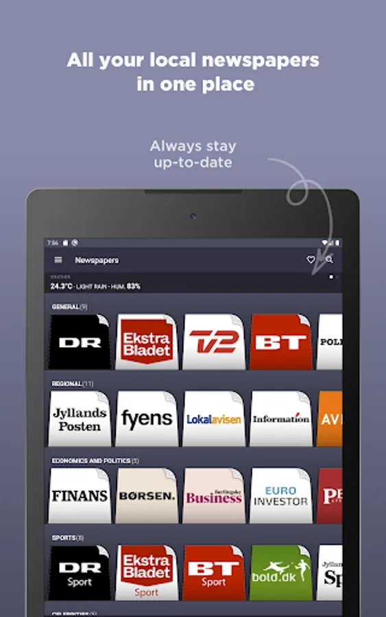 Danish Newspapers is an application that groups all news of the most important newspapers and magazines of Denmark. With this application you can have in one place, all the information you want without browse individual websites of each newspaper or magazine.
