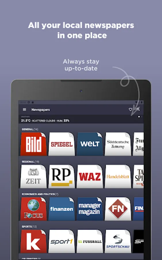 Newspapers are categorized and grouped for better navigation. In this way, you can read bild and, from this one, you can move to other newspapers of the same category (spiegel or welt) by moving up the lower menu. You are going to be able to compare how different newspapers analyze the same news. You can also find important regional newspapers such as zeit or was in the "Regional" category. We also have financial and political sections (you can read these news at focus or finanzen) and, sports fans have kicker and sport1. Fashion magazines could not be missing to be updated on the latest trends, in brigitte, gala and bunte. You can read everything about with celebrities. Additionally for your convenience you can look through many other newspapers in each section.