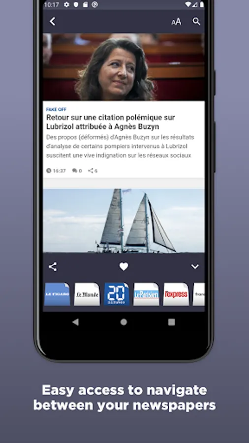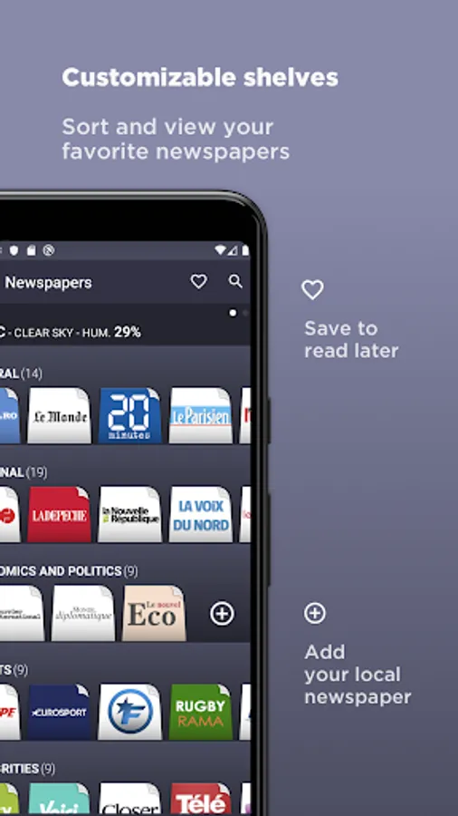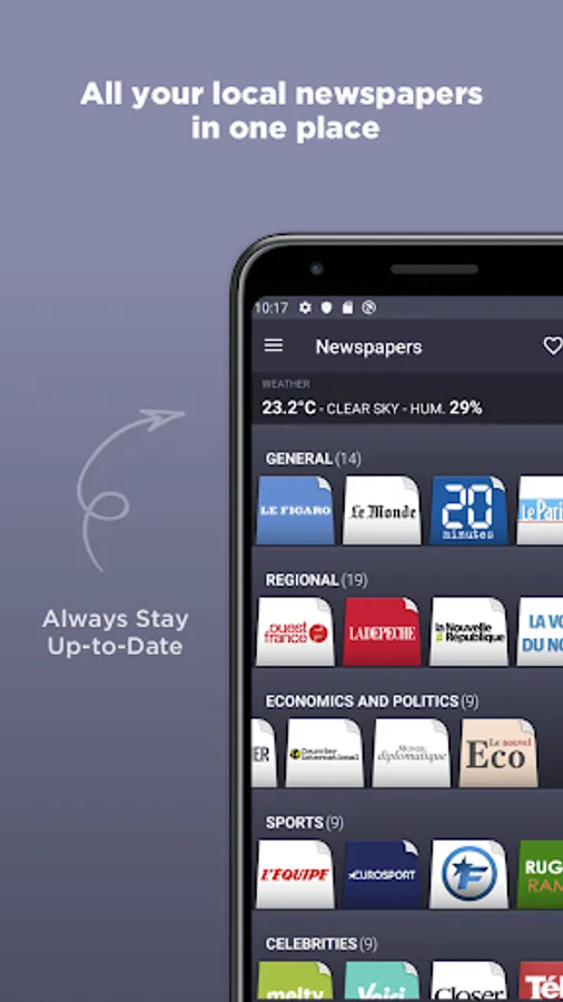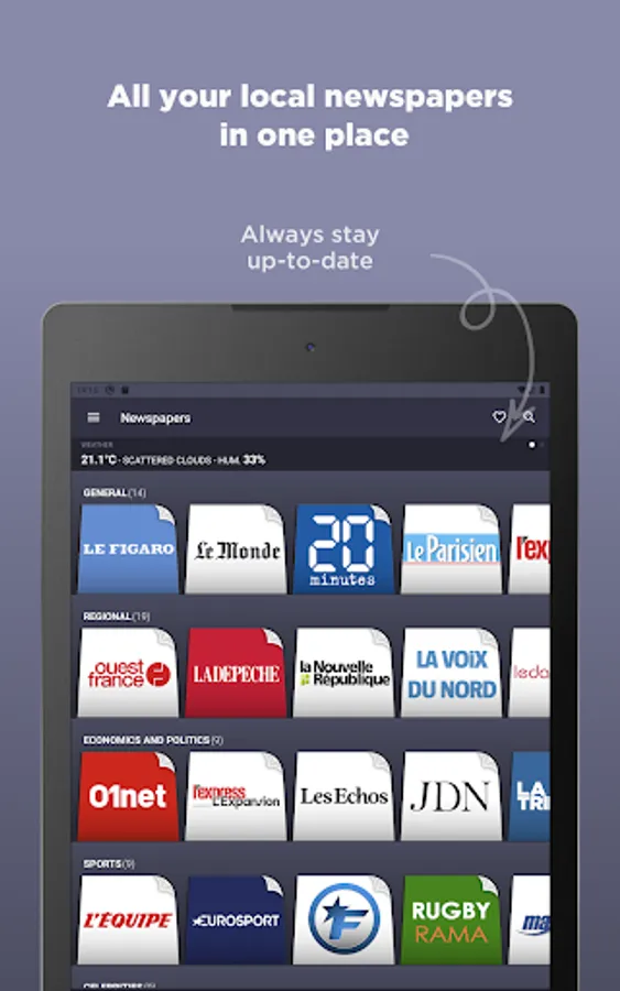 Newspapers are categorized and grouped for better navigation. In this way, you can read le figaro and, from this one, you can move to other newspapers of the same category (le monde or 20 minutes) by moving up the lower menu. You are going to be able to compare how different newspapers analyze the same news. You can also find important regional newspapers such as liberation or la croix in the "Regional" category. We also have financial and political sections (you can read these news at la tribune or les echos) and, sports fans have lequipe and eurosport. Fashion magazines could not be missing to be updated on the latest trends, in elle, vogue and journal des femmes. You can read everything about with celebrities. Additionally for your convenience you can look through many other newspapers in each section.