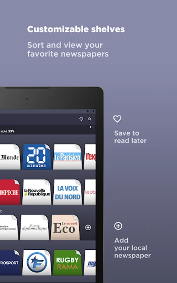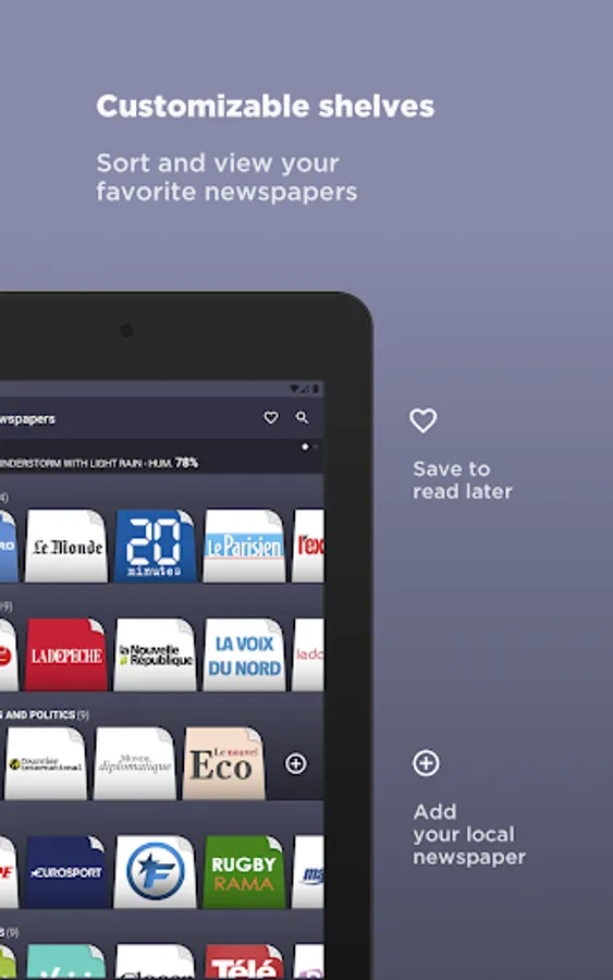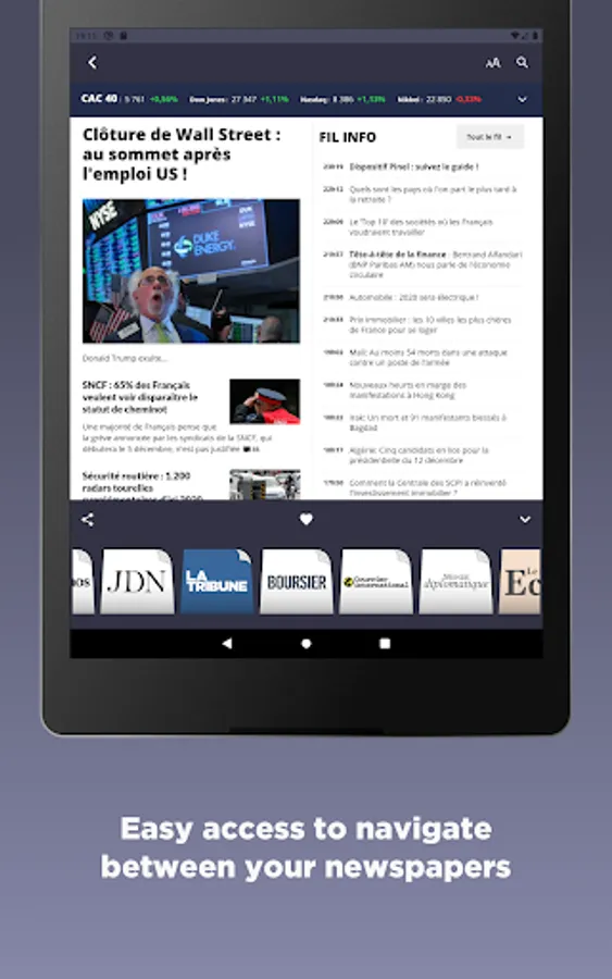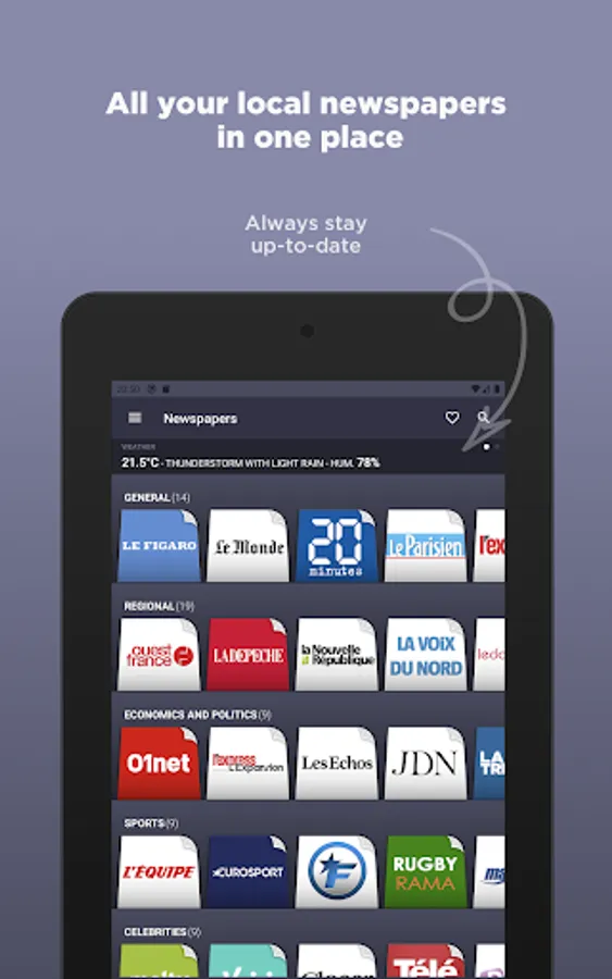 French Newspapers is an application that groups all news of the most important newspapers and magazines of France. With this application you can have in one place, all the information you want without browse individual websites of each newspaper or magazine.