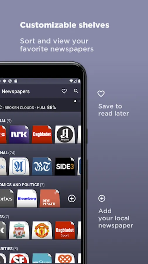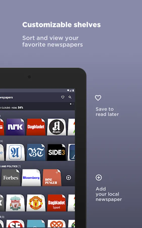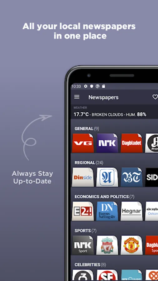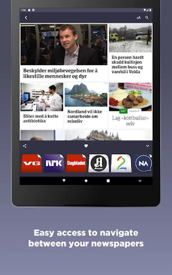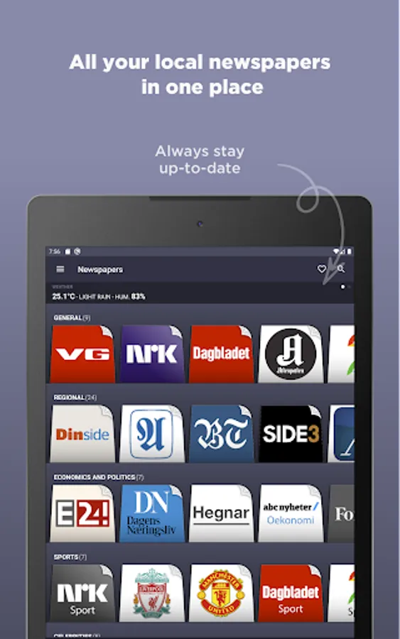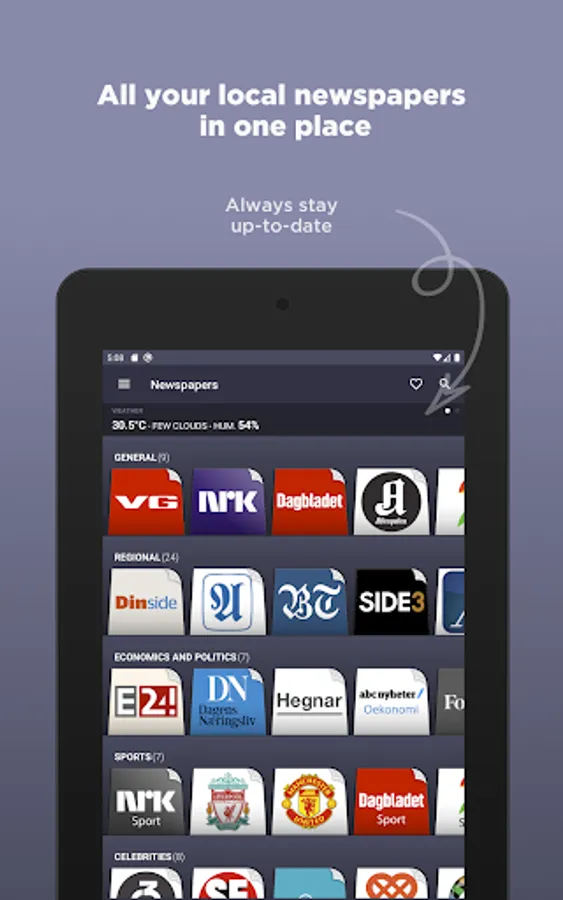 Norwegian Newspapers is an application that groups all news of the most important newspapers and magazines of Norway. With this application you can have in one place, all the information you want without browse individual websites of each newspaper or magazine.