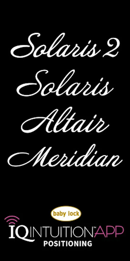Welcome to the Baby Lock IQ Intuition Positioning App! It’s compatible with Baby Lock Solaris 2, Solaris with Upgrade 2, Altair and Meridian embroidery machines.