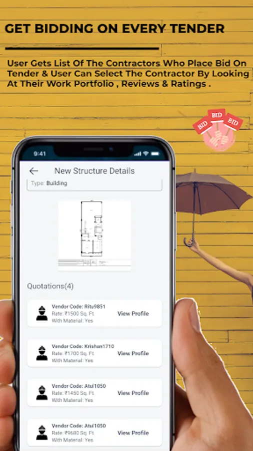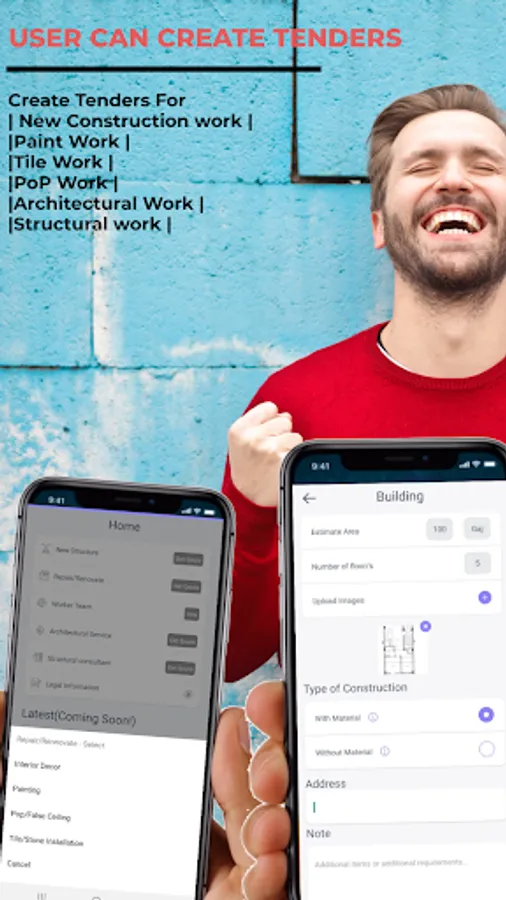 ALSO, YOU CAN CREATE TENDER FOR YOUR OWN WORK WHICH INCLUDES (NEW STRUCTURE, CONSTRUCTION, INTERIOR WORK, TILE WORK, POP-FALSE CEILING WORK, PAINTWORK, ARCHITECTURAL & STRUCTURAL WORK ETC.) AND CONTRACTORS NEAR YOU CAN BID ON THE TENDER WHICH WAS CREATED BY YOU.