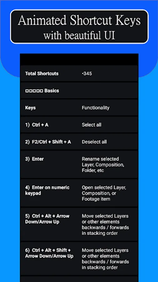 App contains 345 after effects shortcuts keys with introduction.