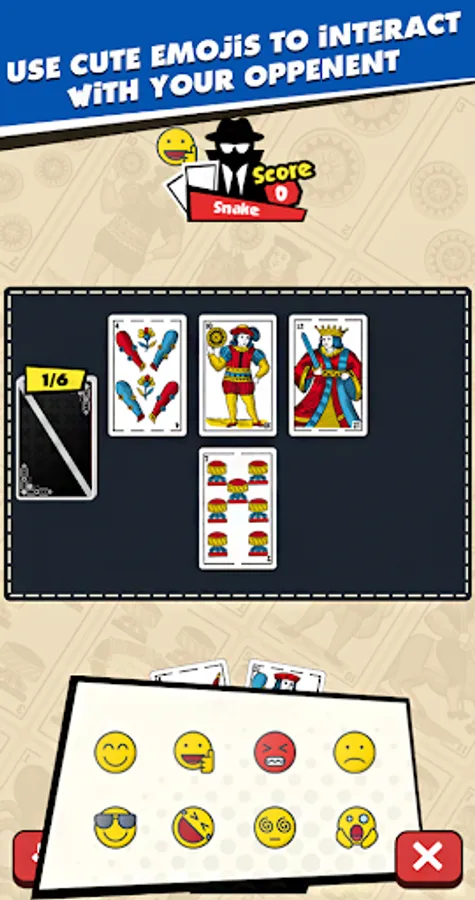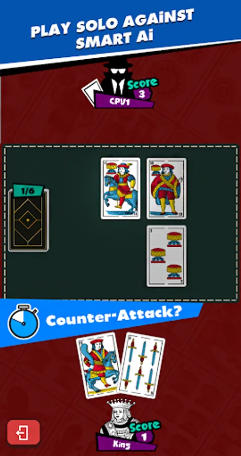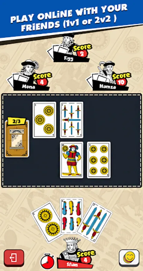 Play the well-known Moroccan card game Ronda on your smartphone today! You can play it casually offline against AI opponent, or you can challenge your friends and play against them online. You can play 1v1 (2 players) or 2v2 (4 players).