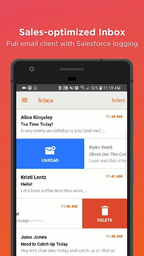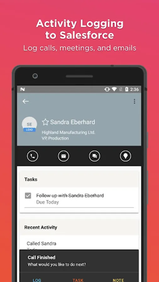 • Data entry on-the-fly with one-tap activity logging of emails, calls, and meetings to CRM accounts, contacts, leads, or opportunities. Data entry automation and auto-filling of fields based on context and usage