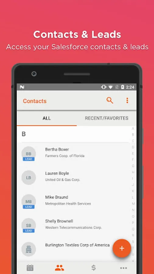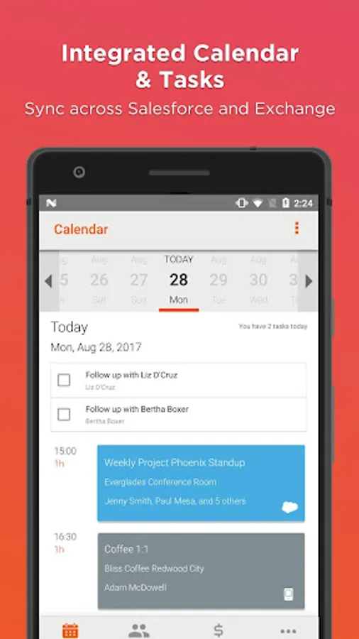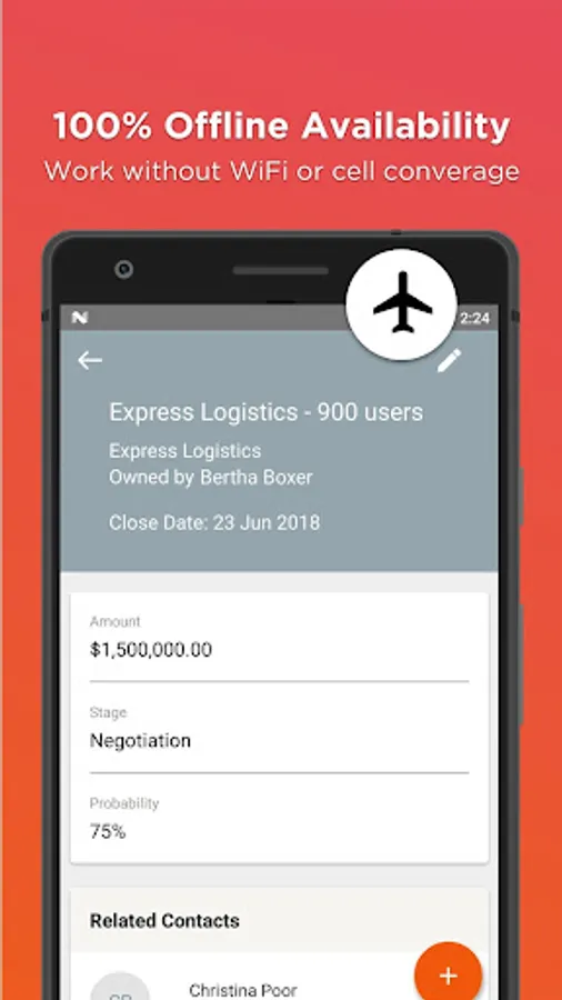 • 100% offline availability—sync CRM leads, contacts, accounts, opportunities, tasks, events, and notes so they're always at your fingertips