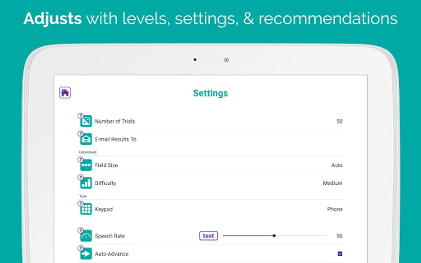 Great for cognitive disorders such as impaired working memory or auditory memory, too! Listen to long numbers and type them in - it's harder than it sounds. Train the ear to listen with this app.