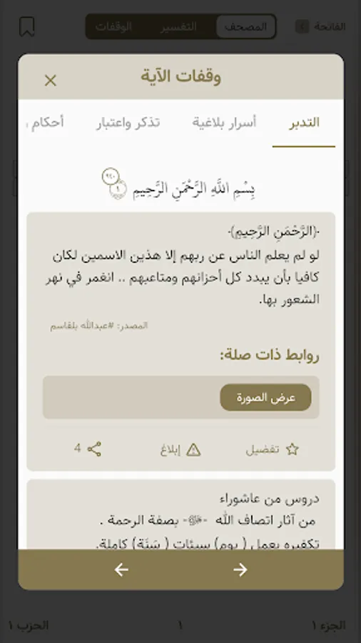* بإمكانك -تصفح وقفات أي عالم او شيخ او متدبر ، وذلك بالضغط مطولا على إسم صاحب الوقفة ، كما يمكنك متابعة جديده ، عندما تقوم بتفضيله في قائمة المصادر المفضلة .