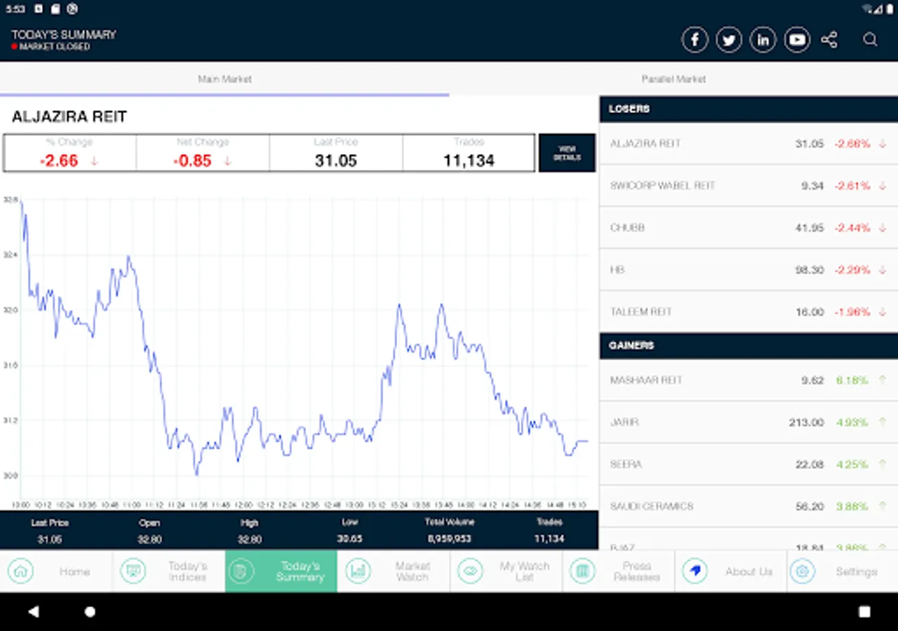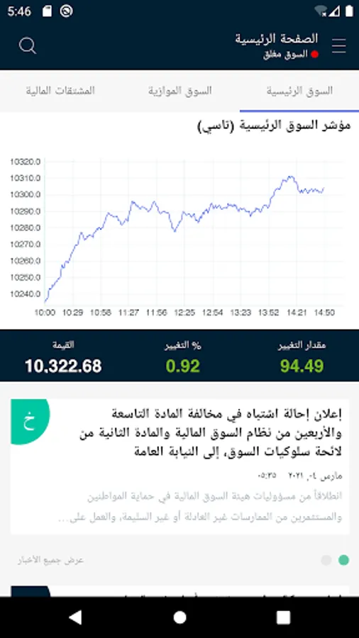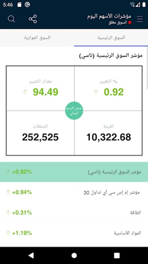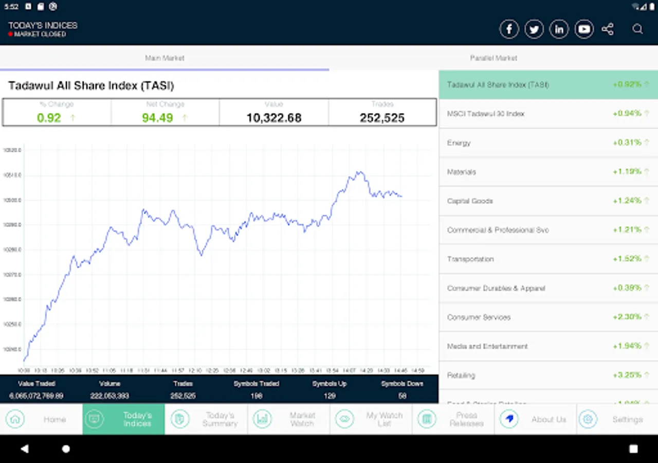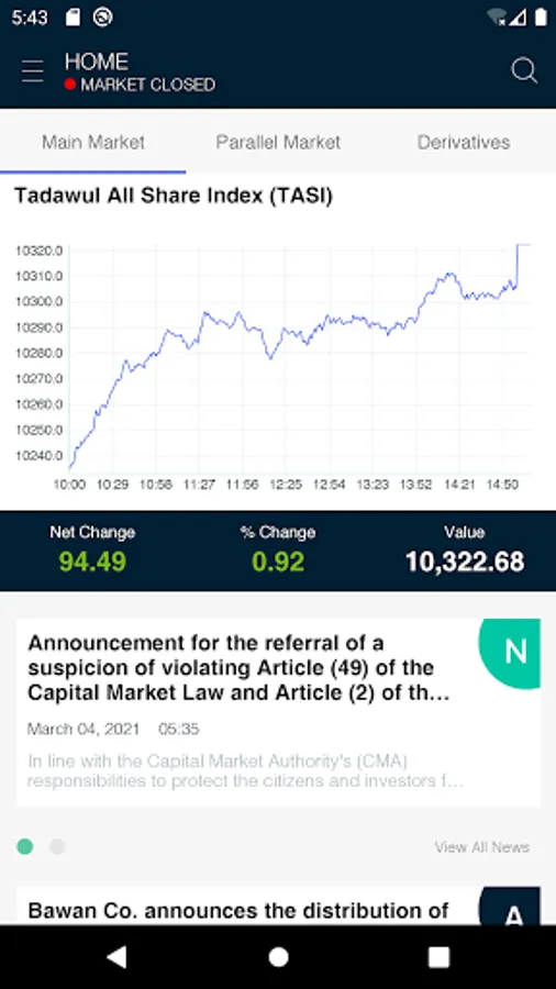 This is the official application of the Saudi Stock Exchange (Tadawul). The application displays the Information of the Saudi Stock Exchange (Tadawul) Equity market index. Information displayed in this application is delayed by 5 minutes from the time of its original dissemination. The application allows users to: