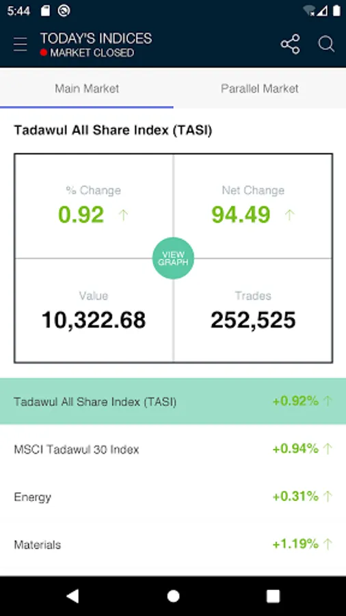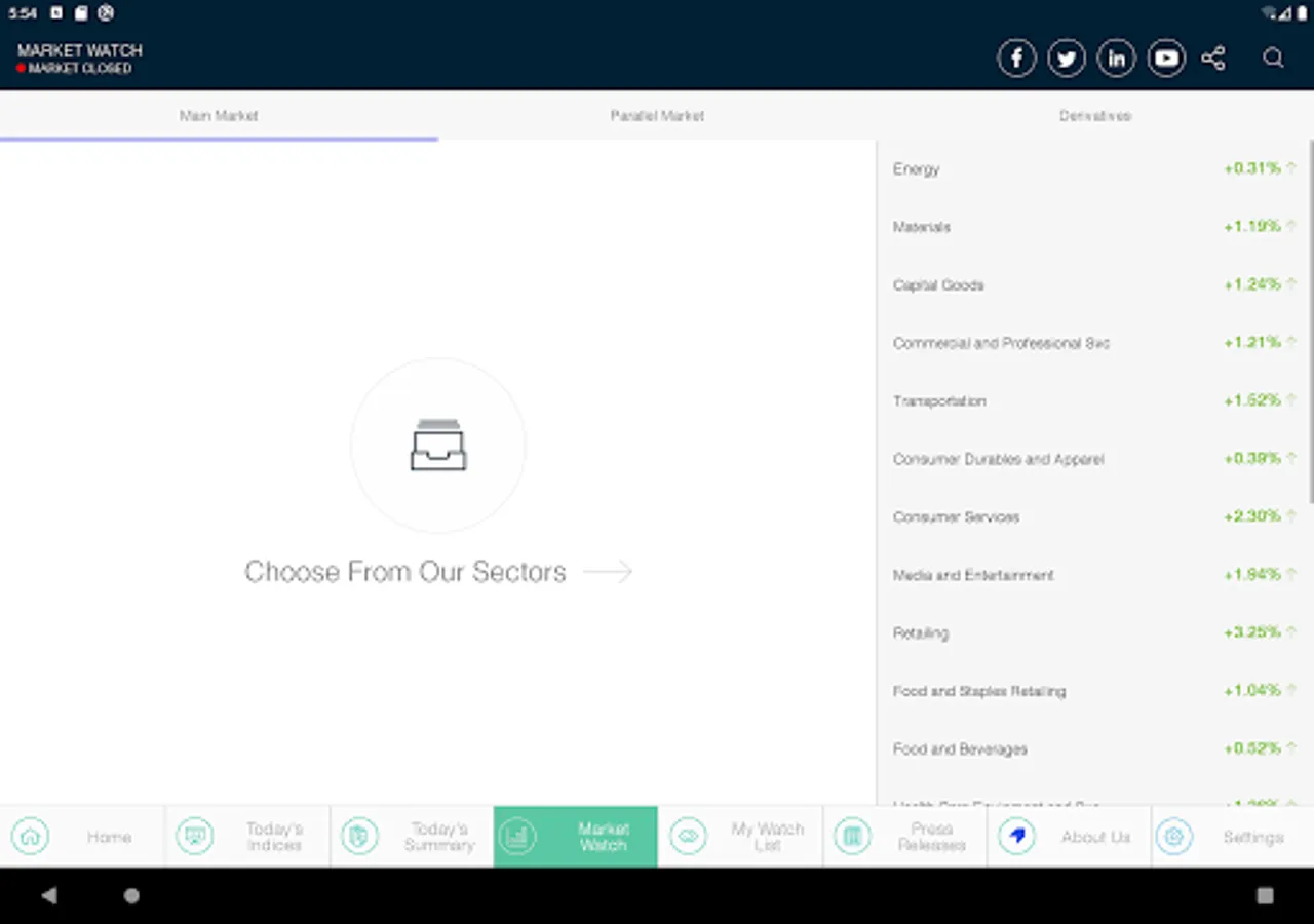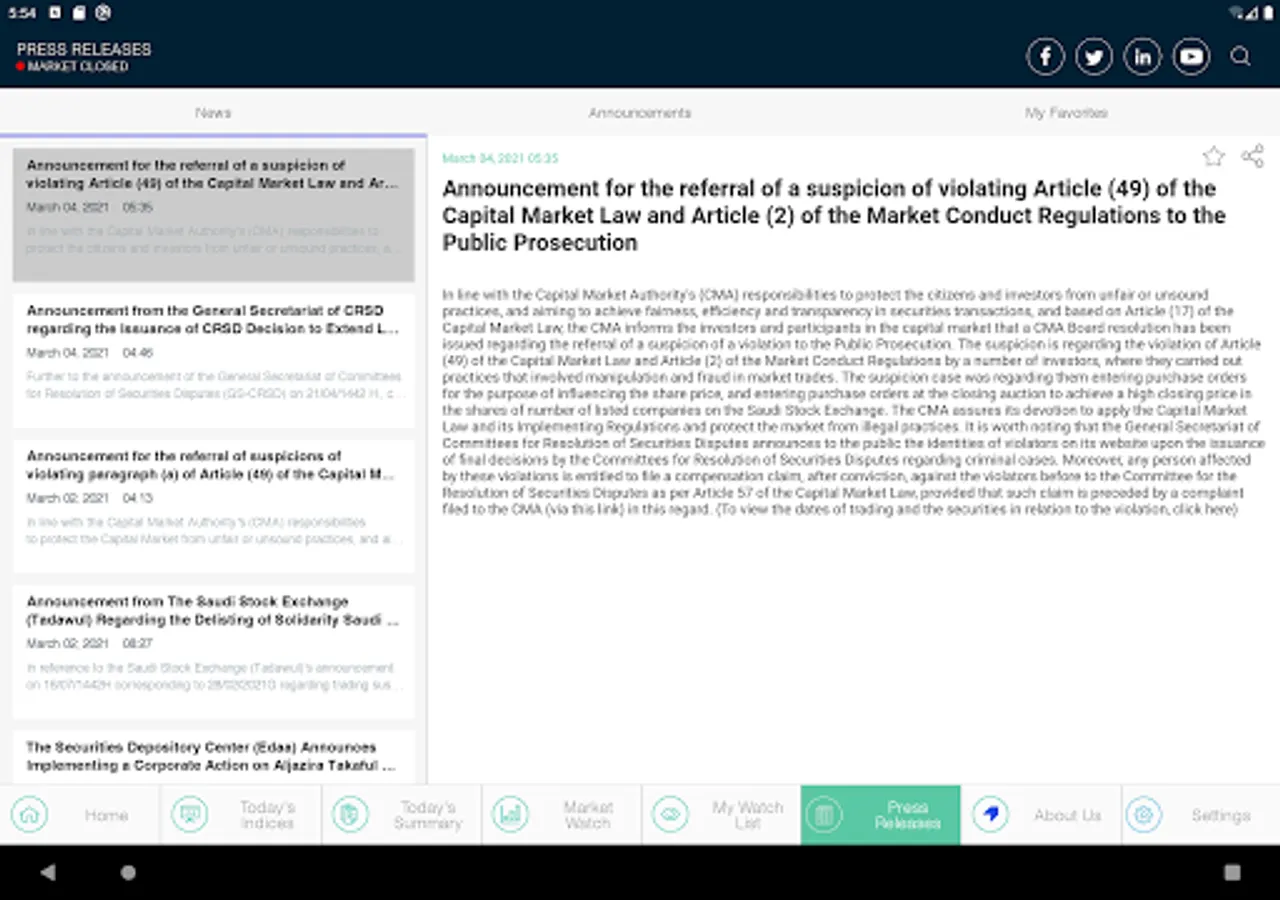 This is the official application of the Saudi Stock Exchange (Tadawul). The application displays the Information of the Saudi Stock Exchange (Tadawul) Equity market index. Information displayed in this application is delayed by 5 minutes from the time of its original dissemination. The application allows users to: