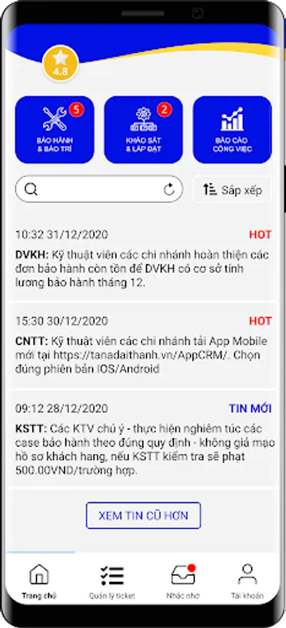 Tan A Dai Thanh is a mobile application for technicians to receive and process warranty and maintenance requests from Tan A Dai Thanh to coordinate. The main functions include: Request management; update processing status; activate product warranty for customers; manage notifications, reminders, and notices from TADT; view work report; view account and star rating.
