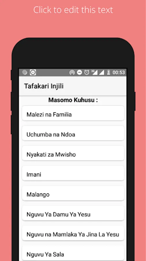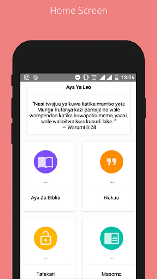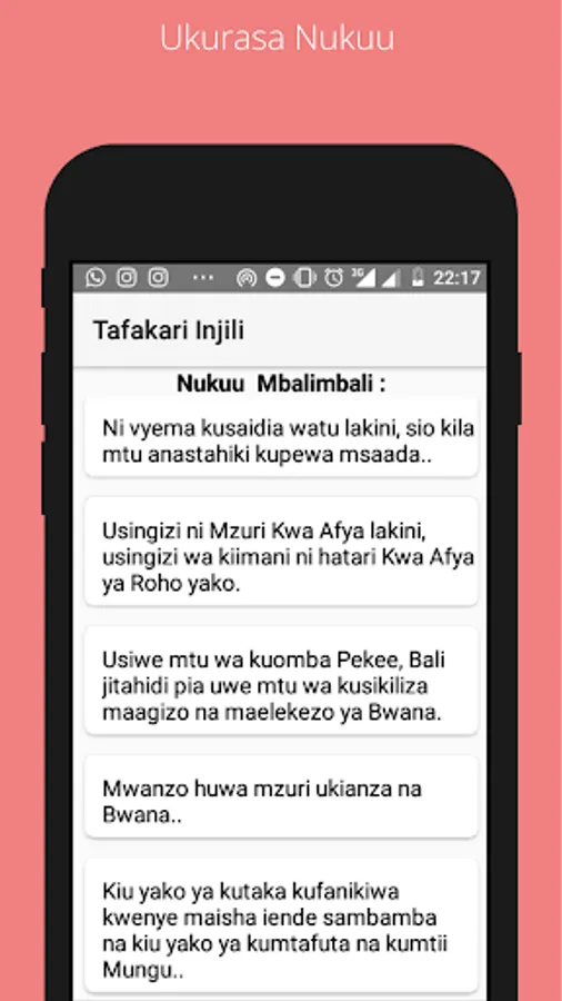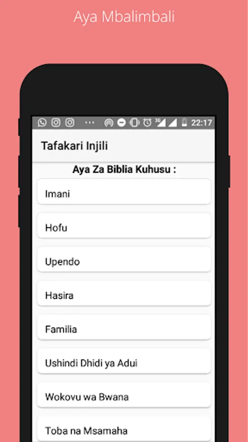 Hapa tunapata Aya mbalimbali za Biblia zilizowekwa kwenye makundi mbalimbali kama vile Aya zinazohusu Amani,Imani, Familia,Upendo,Ahadi za Mungu,Ulinzi wa MUngu, Uvumilivu, Kushinda Hofu n.k. Yote ikiwa na lengo la kuwasaidia namna ya kusimamia neno la Mungu kulingana na halia ama changamoto wanazopitia